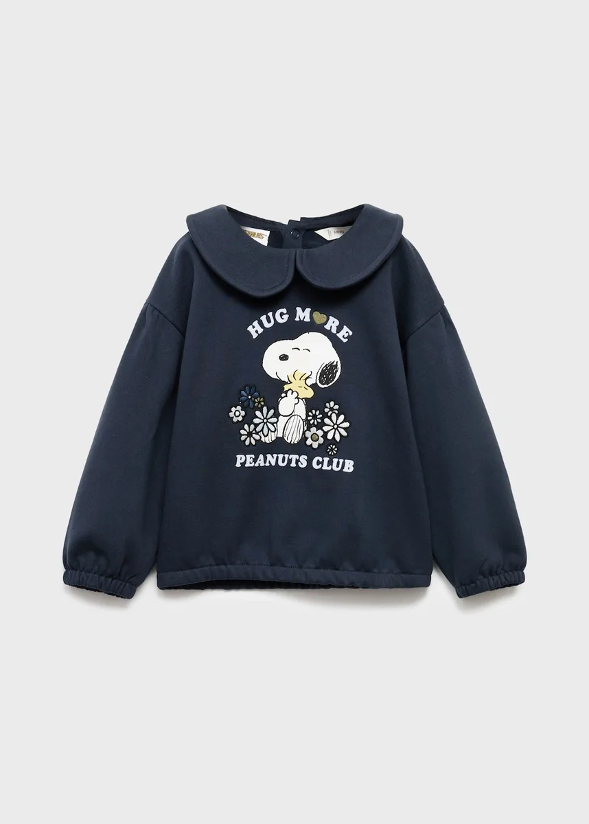 Tessuto 100% cotone. Disegno stampato. Motivo Snoopy. Colletto babydoll. Maniche lunghe con polsini elasticizzati. Orlo con elastico. Motivi stampati e ricamati sul davanti. Ritorno a scuola