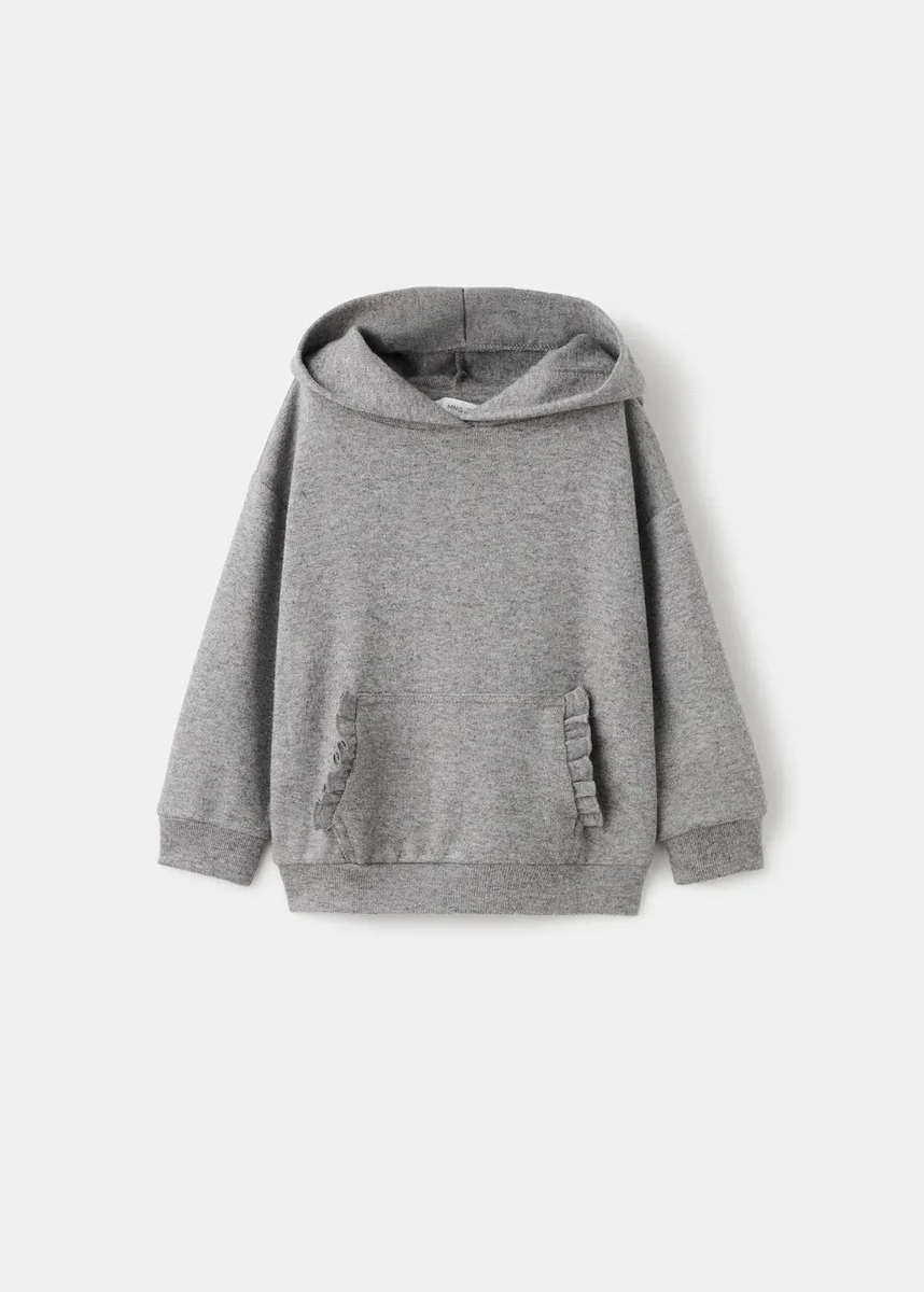 Tessuto fluido. Modello dritto. Con cappuccio. Tasca a marsupio. Maniche lunghe. Dettaglio decorativo con volant sulla tasca