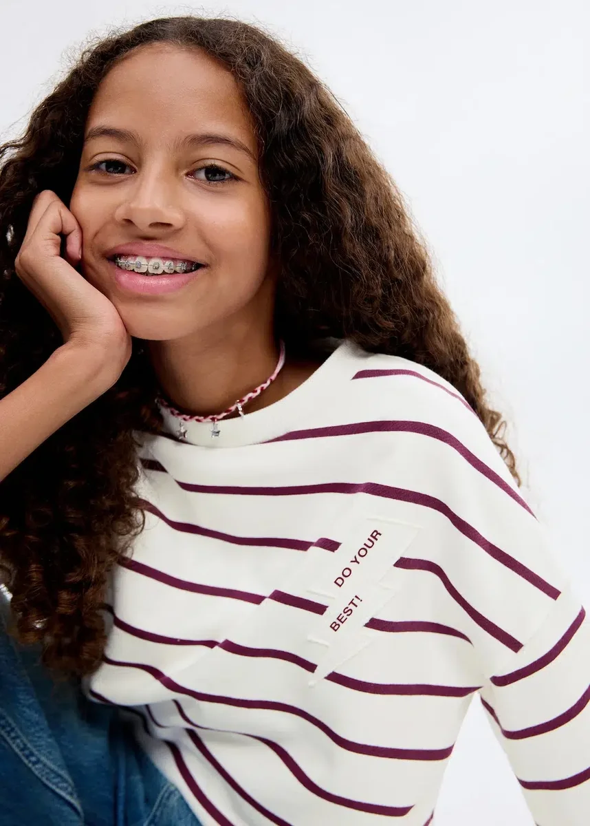 Tessuto 100% cotone. Tessuto a righe. Design dritto. Design ricamato. Ricamo fulmine. Girocollo. Maniche lunghe. Collo, polsini e orlo a costine
