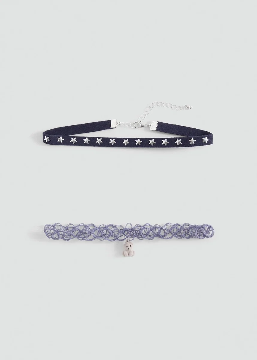 Confezione da 2. Modello girocollo. Ciondolo a forma di orsetto. Decorazione a stella. Chiusura con gancio.