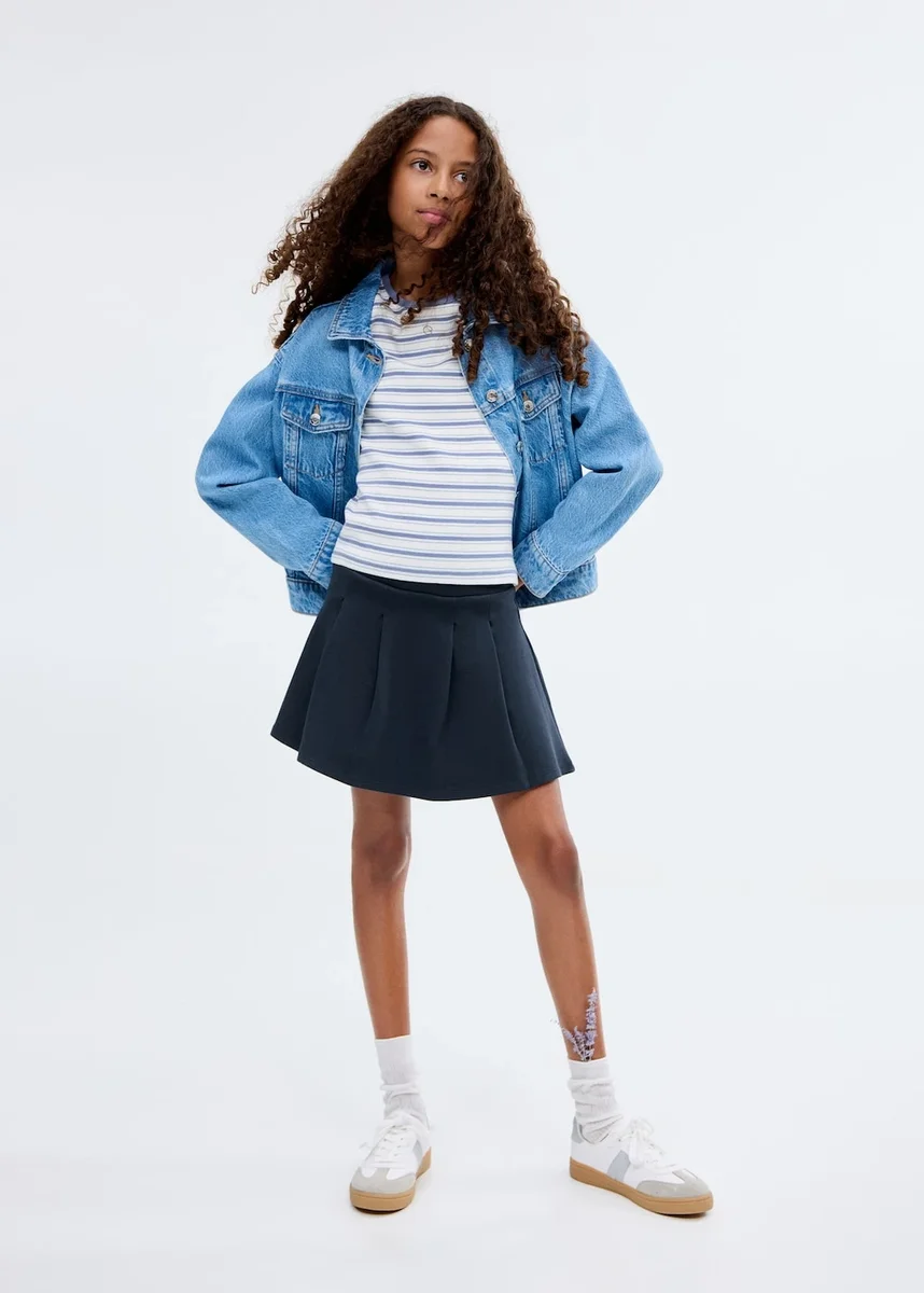 Realizzato in tessuto di cotone lavorato a maglia, questo capo presenta un design corto e dritto. Le pieghe decorative aggiungono dettagli, mentre la vita elasticizzata garantisce comfort. Nessuna chiusura.