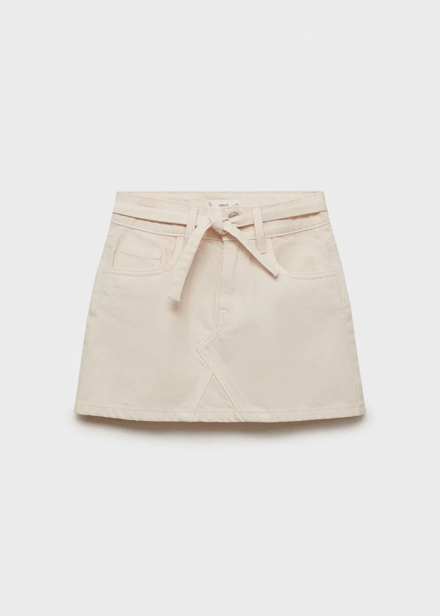 Realizzata in tessuto di cotone stile denim, questa gonna presenta un design corto con una silhouette ad A. Presenta una chiusura frontale con cerniera e bottone e un fiocco che aggiunge un tocco distintivo.