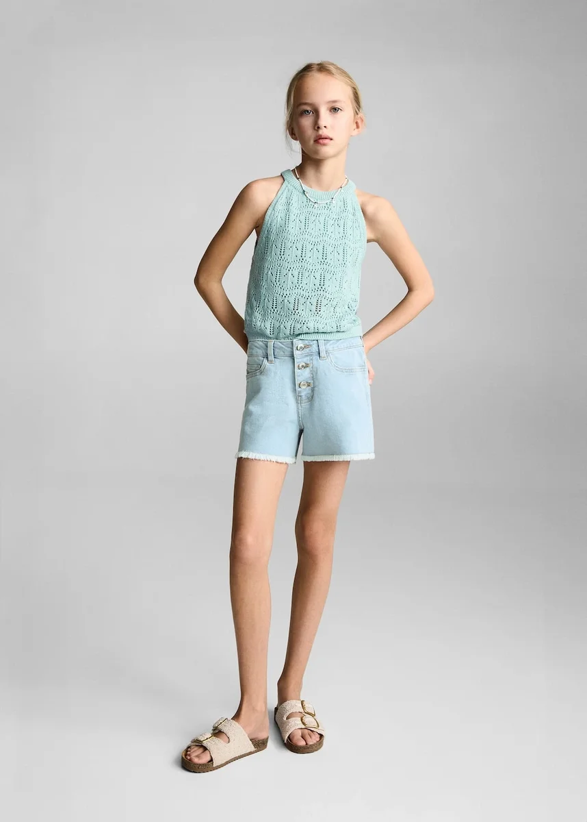Tessuto denim di cotone. Modello dritto. Modello corto. Tre tasche anteriori. Due tasche applicate sul retro. Passanti per cintura. Orlo sfrangiato. Vita regolabile. Chiusura frontale con tre bottoni.