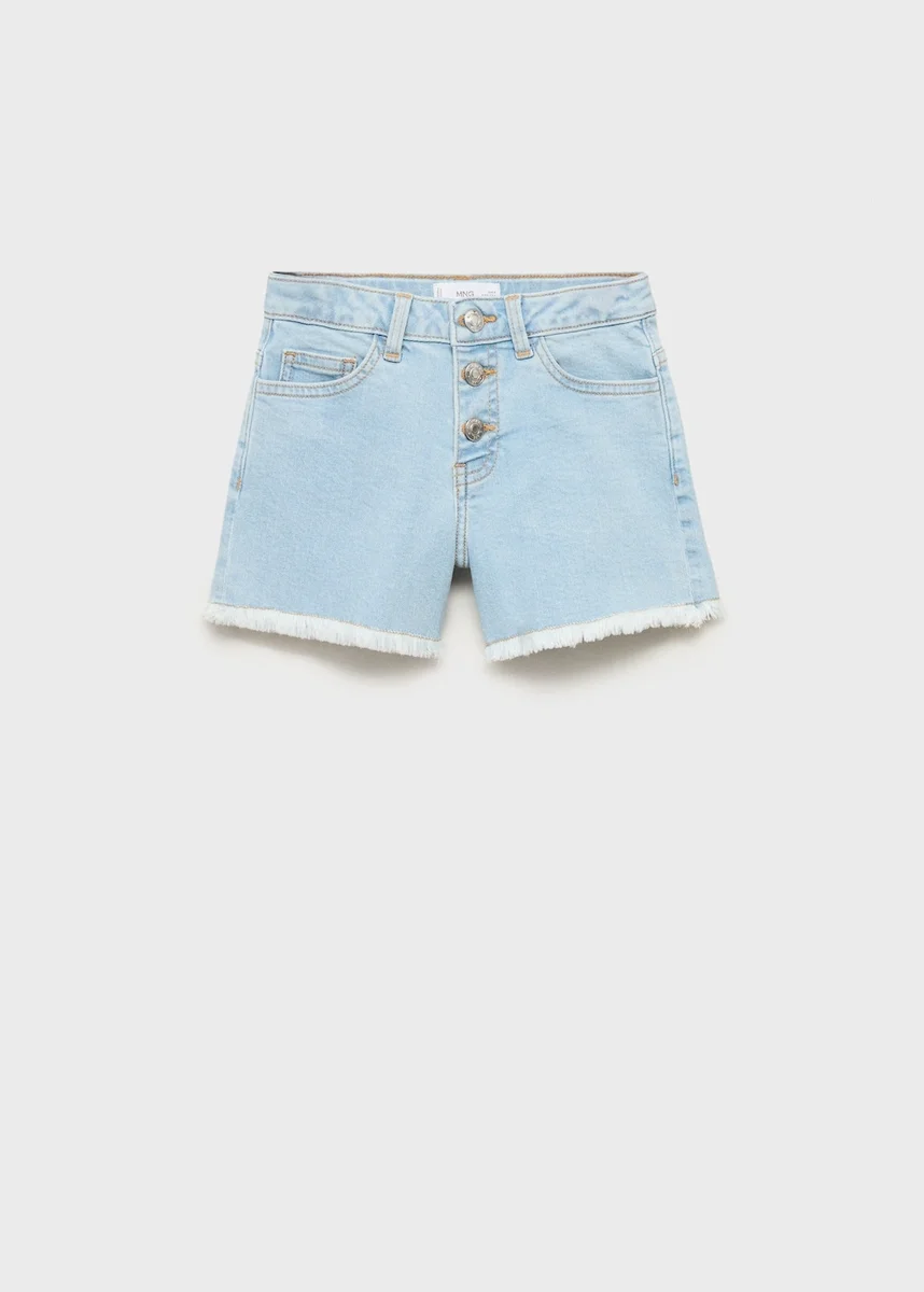 Tessuto denim di cotone. Modello dritto. Modello corto. Tre tasche anteriori. Due tasche applicate sul retro. Passanti per cintura. Orlo sfrangiato. Vita regolabile. Chiusura frontale con tre bottoni