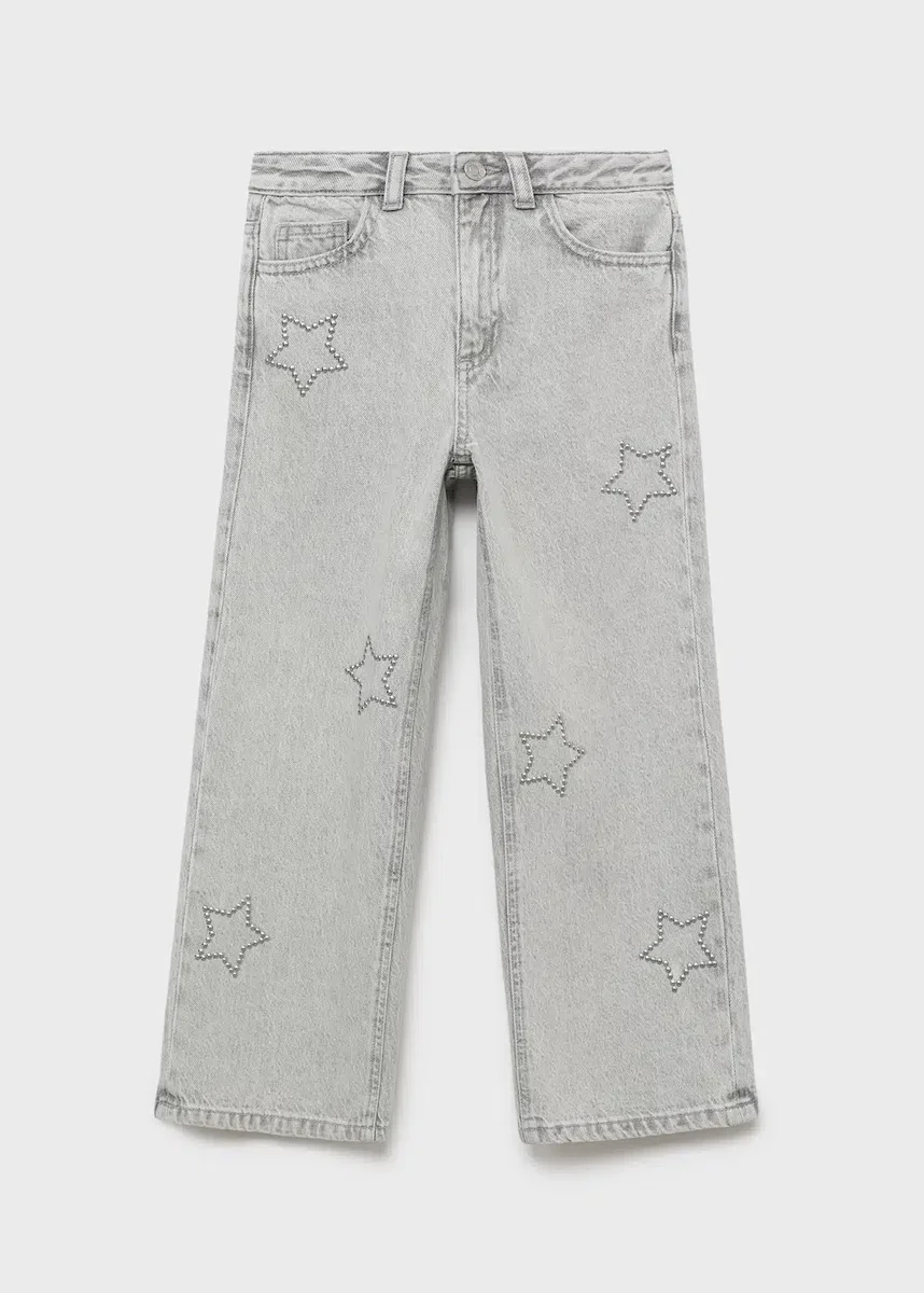 Tessuto 100% cotone. Modello lungo. Modello a gamba larga. Motivo a stelle. Borchie decorative. Passanti per cintura. Chiusura con bottone e cerniera. Due tasche laterali. Due tasche applicate sul retro