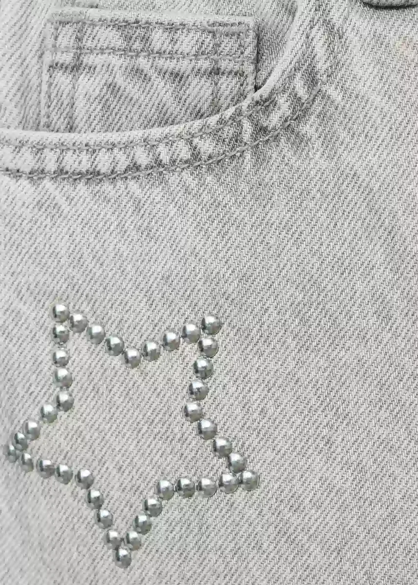 Tessuto 100% cotone. Modello lungo. Modello a gamba larga. Motivo a stelle. Borchie decorative. Passanti per cintura. Chiusura con bottone e cerniera. Due tasche laterali. Due tasche applicate sul retro.
