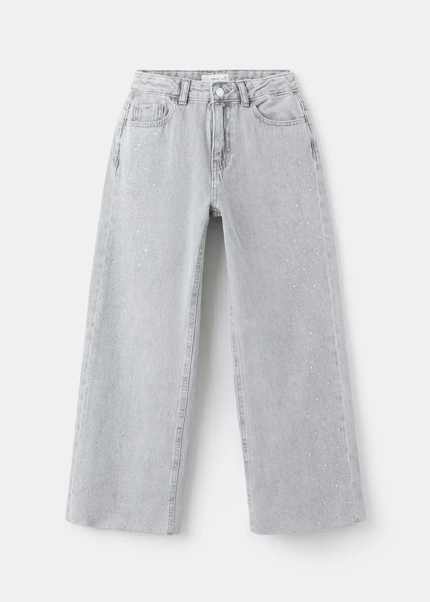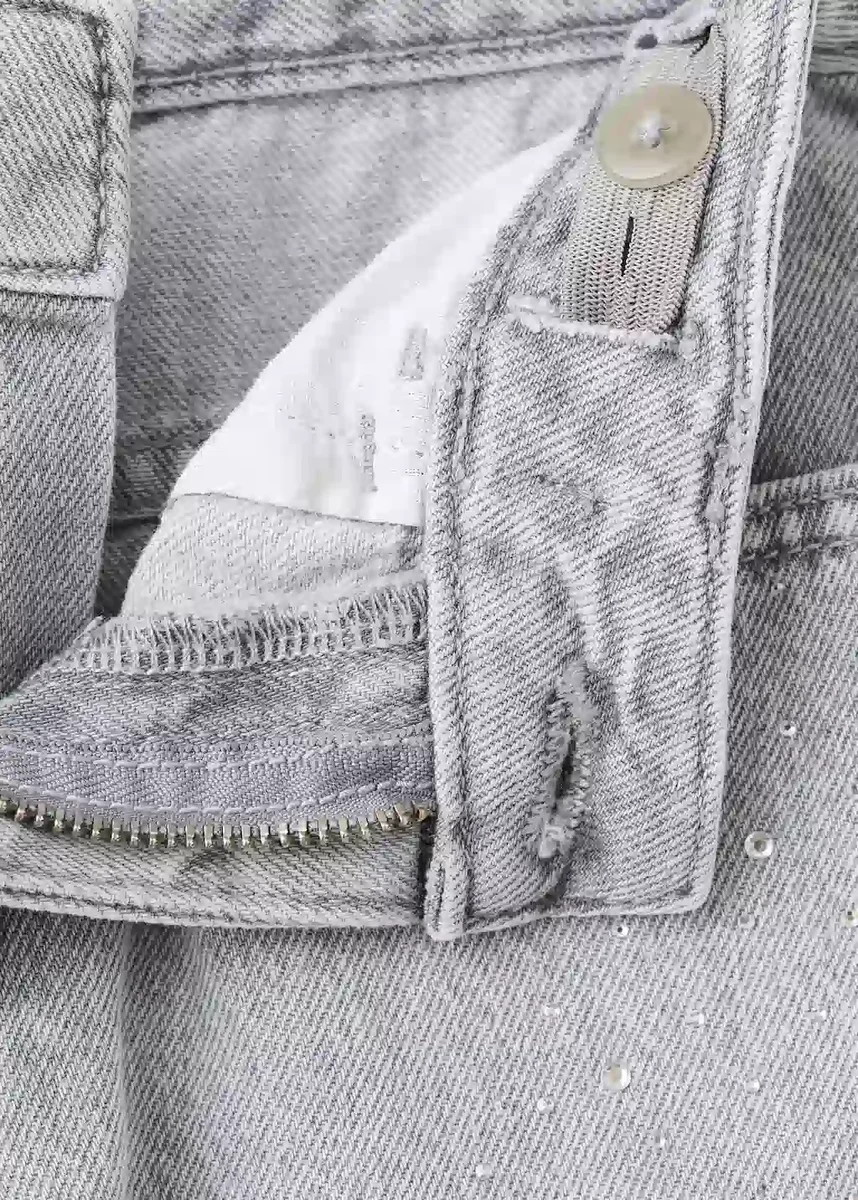 Tessuto 100% cotone stile denim. Design a gamba larga. Design con strass. Design lungo. Passanti per cintura. Cinque tasche. Chiusura frontale con cerniera e bottone. Orlo sfrangiato