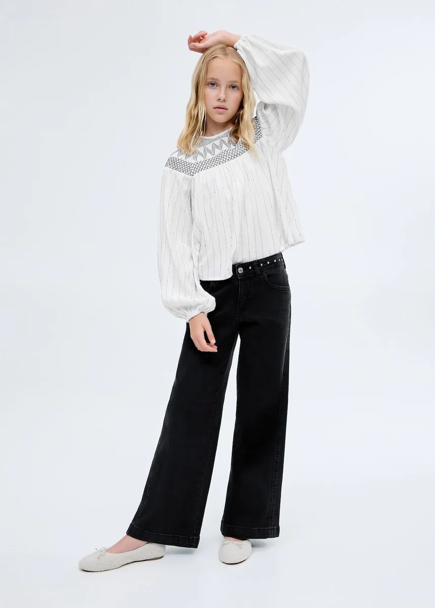 Tessuto in cotone. Tessuto elasticizzato. Modello lungo. Modello a gamba larga. Vita bassa. Passanti per cintura. Chiusura con bottoni e cerniera. Due tasche laterali. Due tasche applicate sul retro. Dettagli con borchie