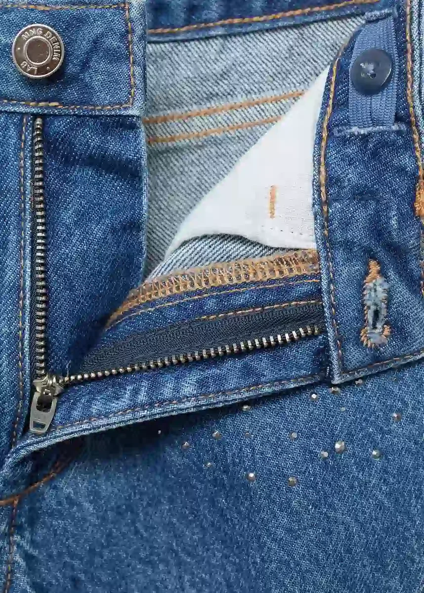 Tessuto 100% cotone. Modello lungo. Design culotte. Vita regolare. Passanti per cintura. Chiusura con zip e bottone. Due tasche laterali. Due tasche applicate sul retro. Orlo sfrangiato. Decorazioni in strass.