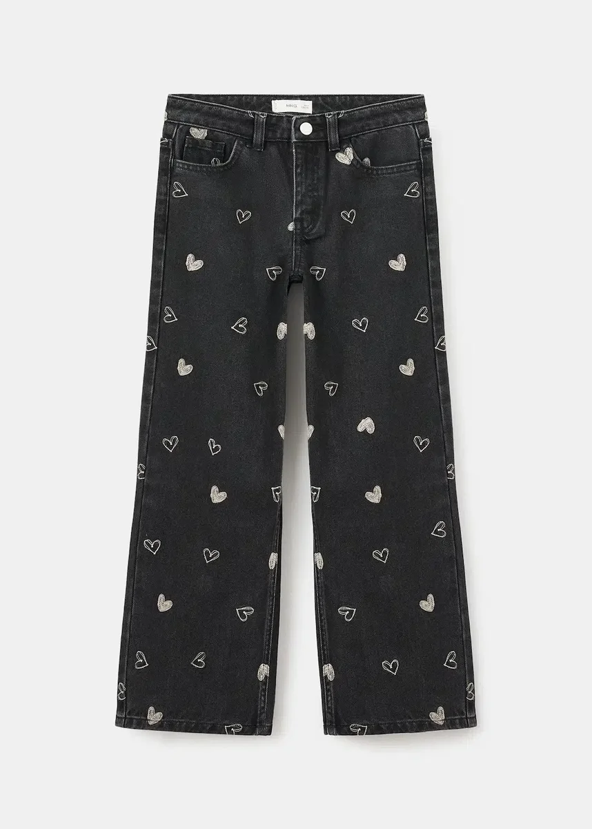 Tessuto 100% cotone. Design dritto. Motivo a cuori. Cuore ricamato. Passanti per cintura. Chiusura con bottone e cerniera. Due tasche laterali. Due tasche applicate sul retro.