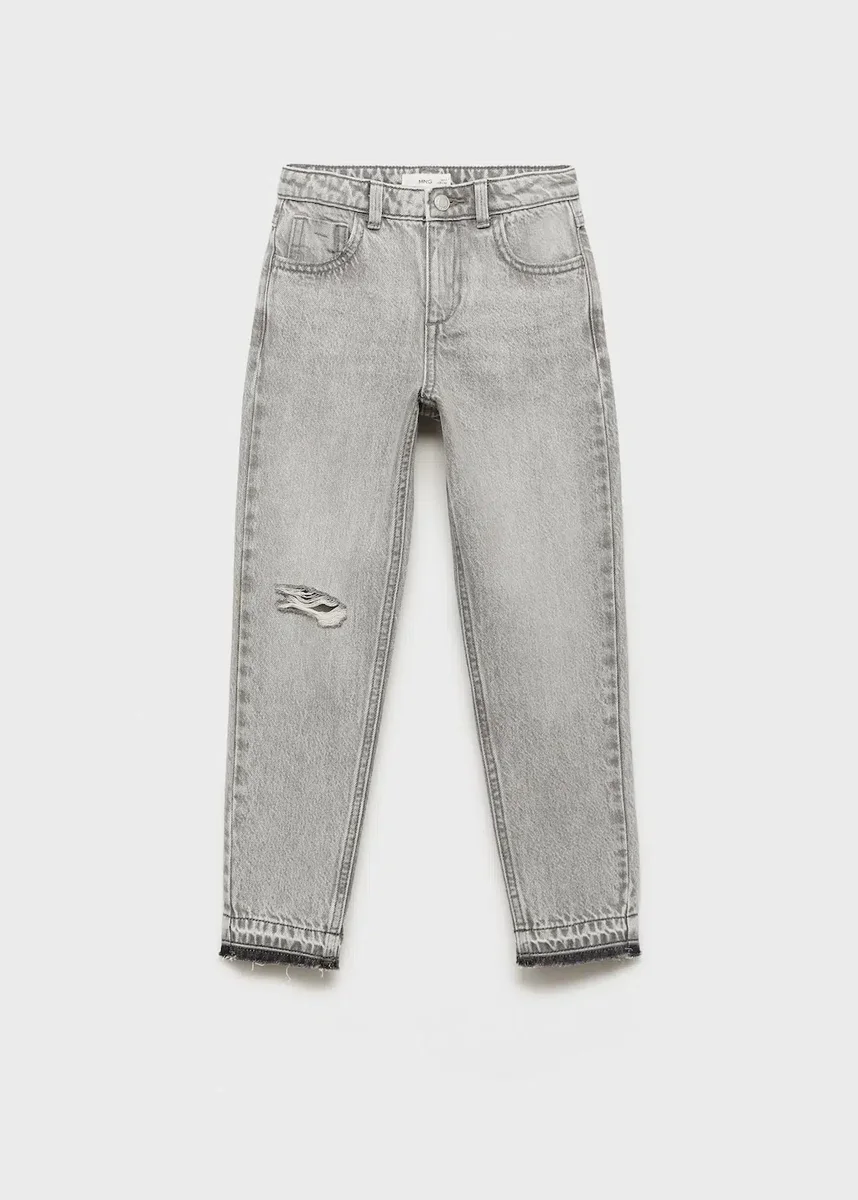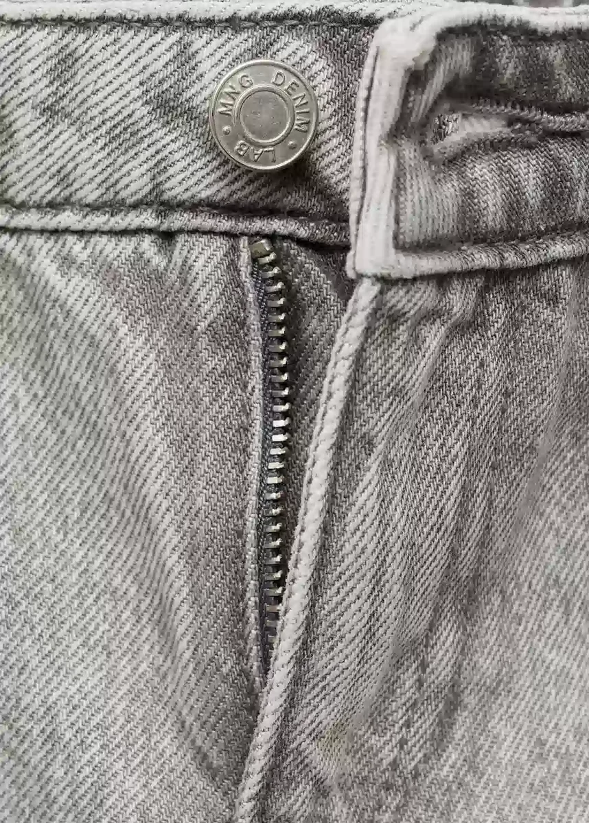 Tessuto 100% cotone. Modello jeans in denim. Vestibilità mom. Taglio lungo. Passanti per cintura. Chiusura con bottone e zip. Tasca portamonete. Due tasche laterali. Orlo sfrangiato.