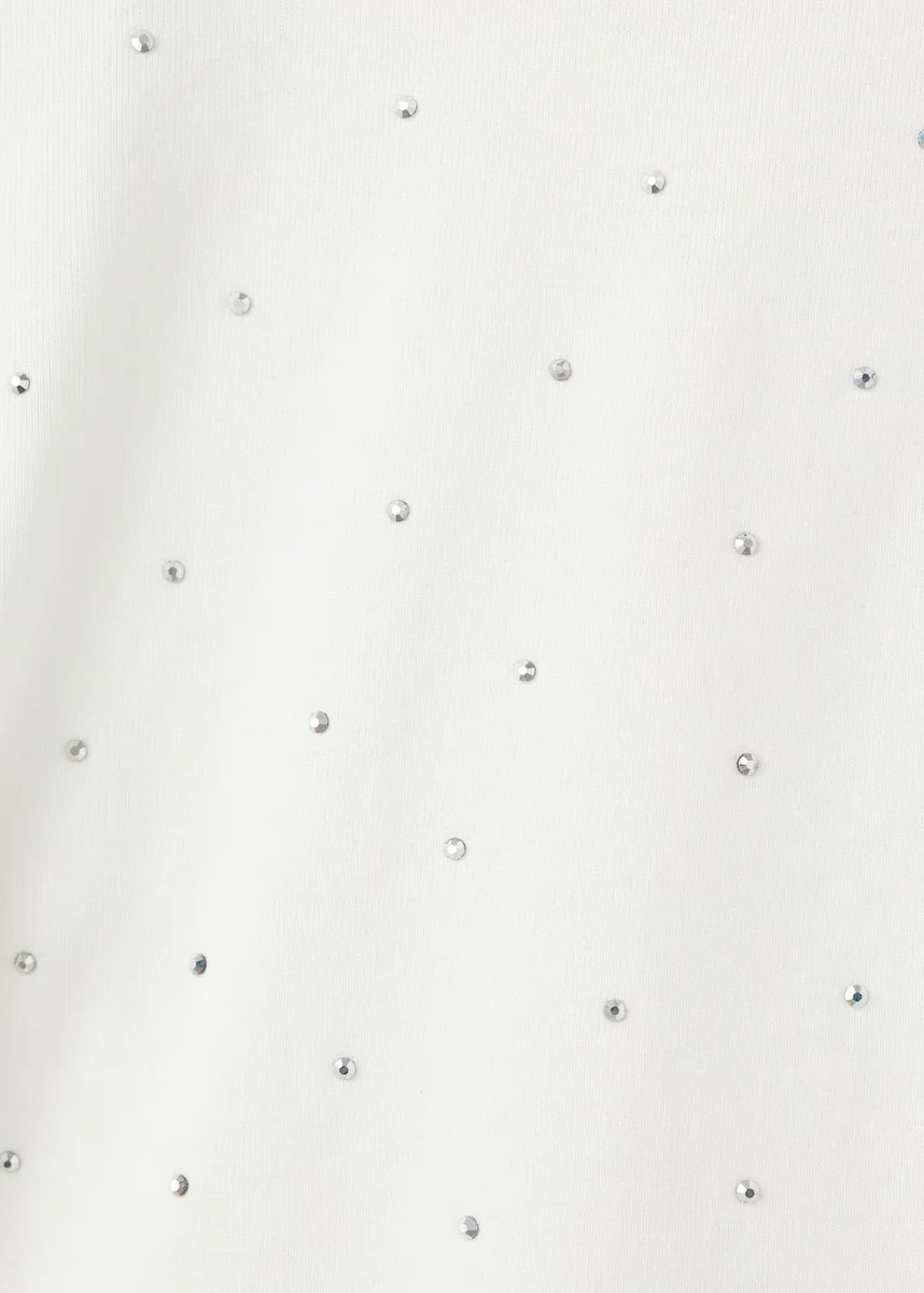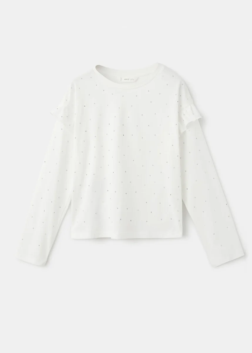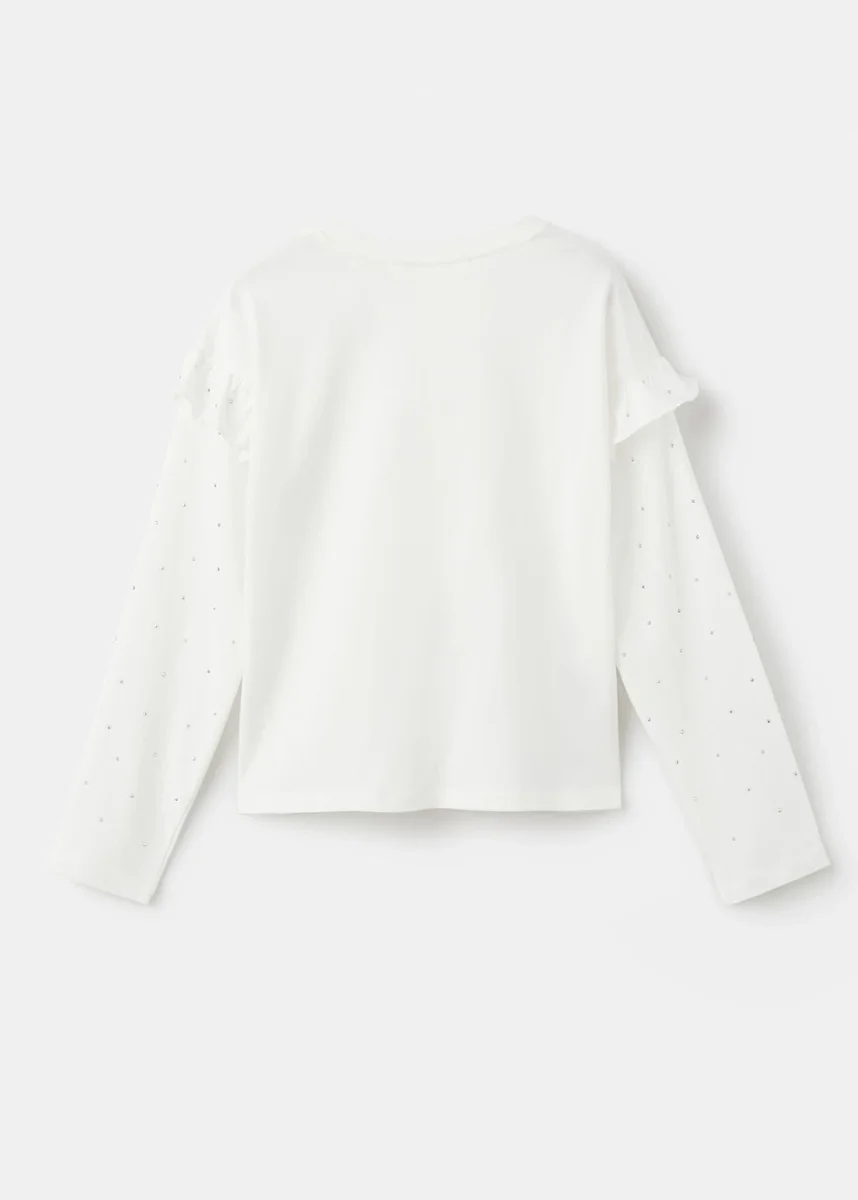 Tessuto 100% cotone. Design lucido. Strass fantasia. Girocollo. Maniche lunghe. Volant sulle spalle. Collezione Party. Collezione Natale. Black Friday.