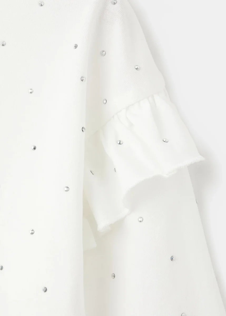 Tessuto 100% cotone. Design lucido. Fantasy Strass. Girocollo. Maniche lunghe. Volant sulle spalle. Collezione Party. Collezione Natale. Black Friday
