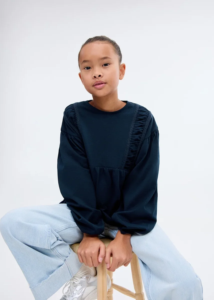 Tessuto 100% cotone. Design dritto. Dettagli arricciati. Girocollo con chiusura a bottoni. Maniche lunghe con polsini elasticizzati