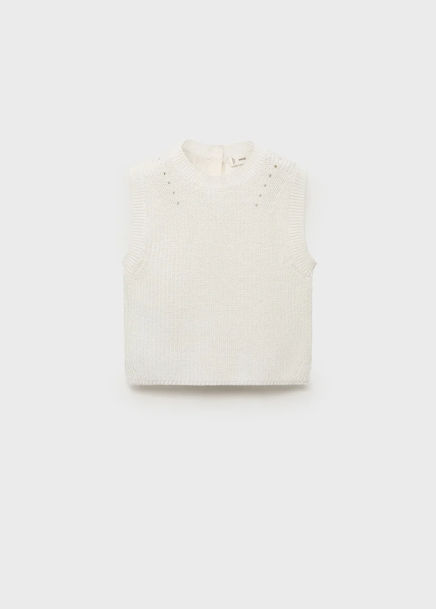 Tessuto 100% cotone. Tessuto lavorato a maglia. Modello dritto. Girocollo. Senza maniche. Chiusura con bottoni sul retro