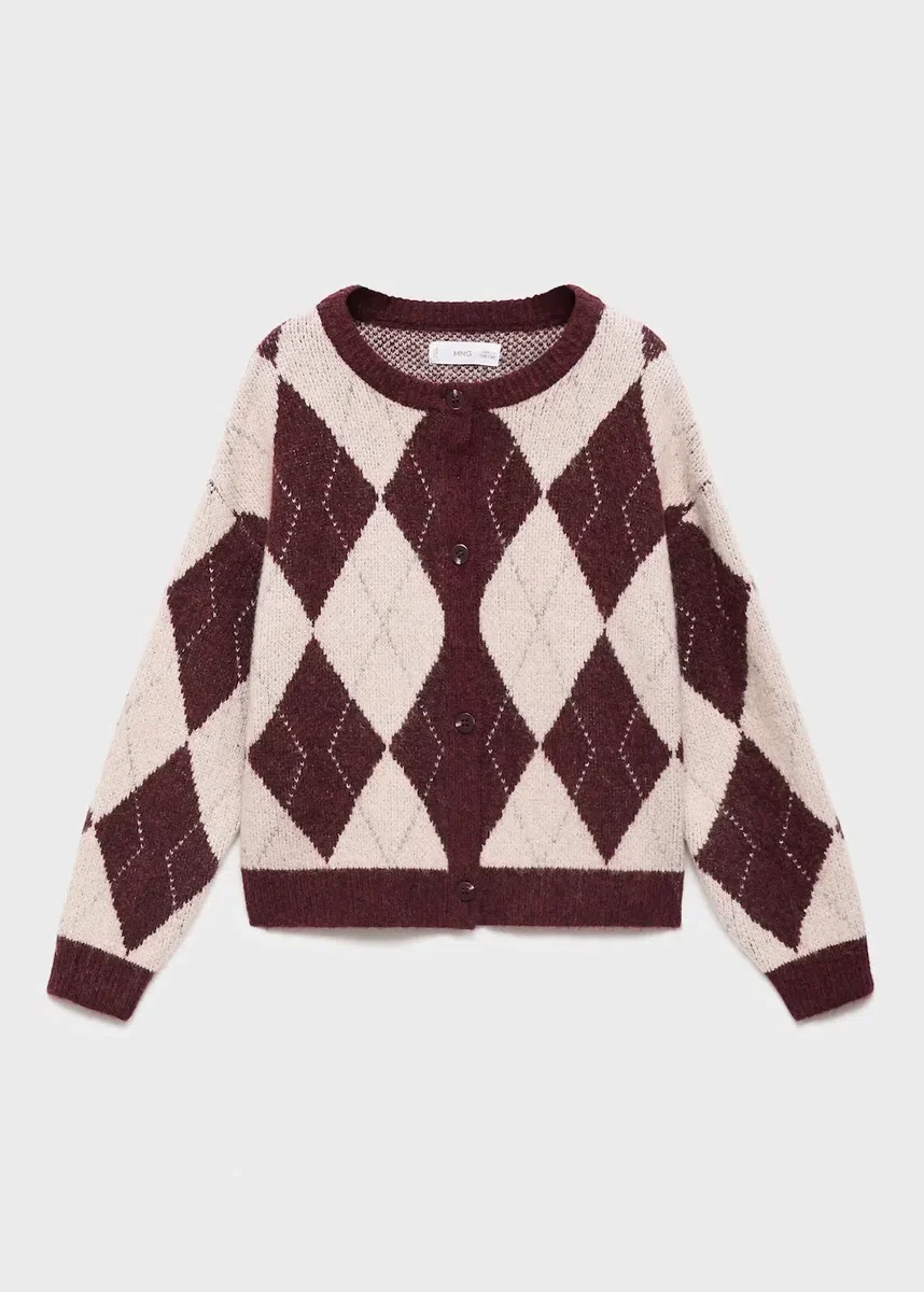 Tessuto a maglia. Tessuto lurex. Motivo a rombi. Girocollo. Maniche lunghe. Chiusura frontale con bottoni