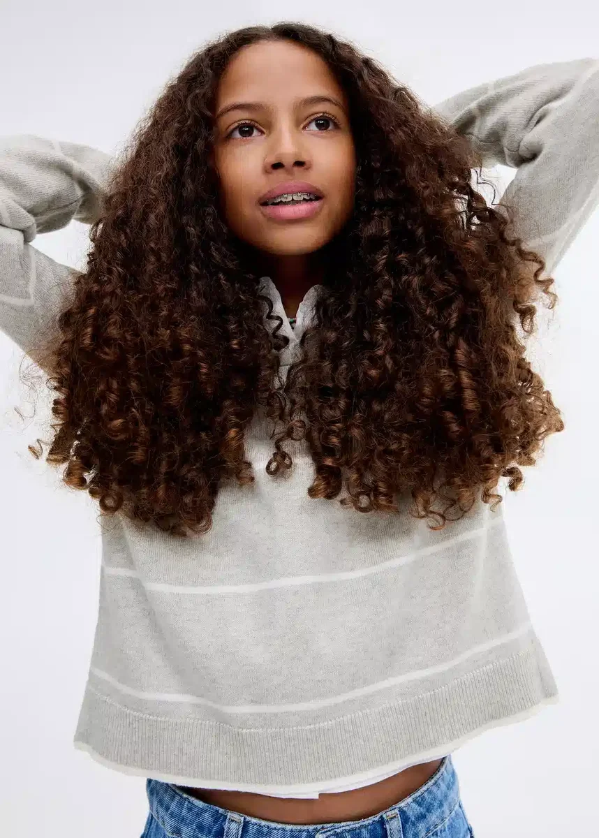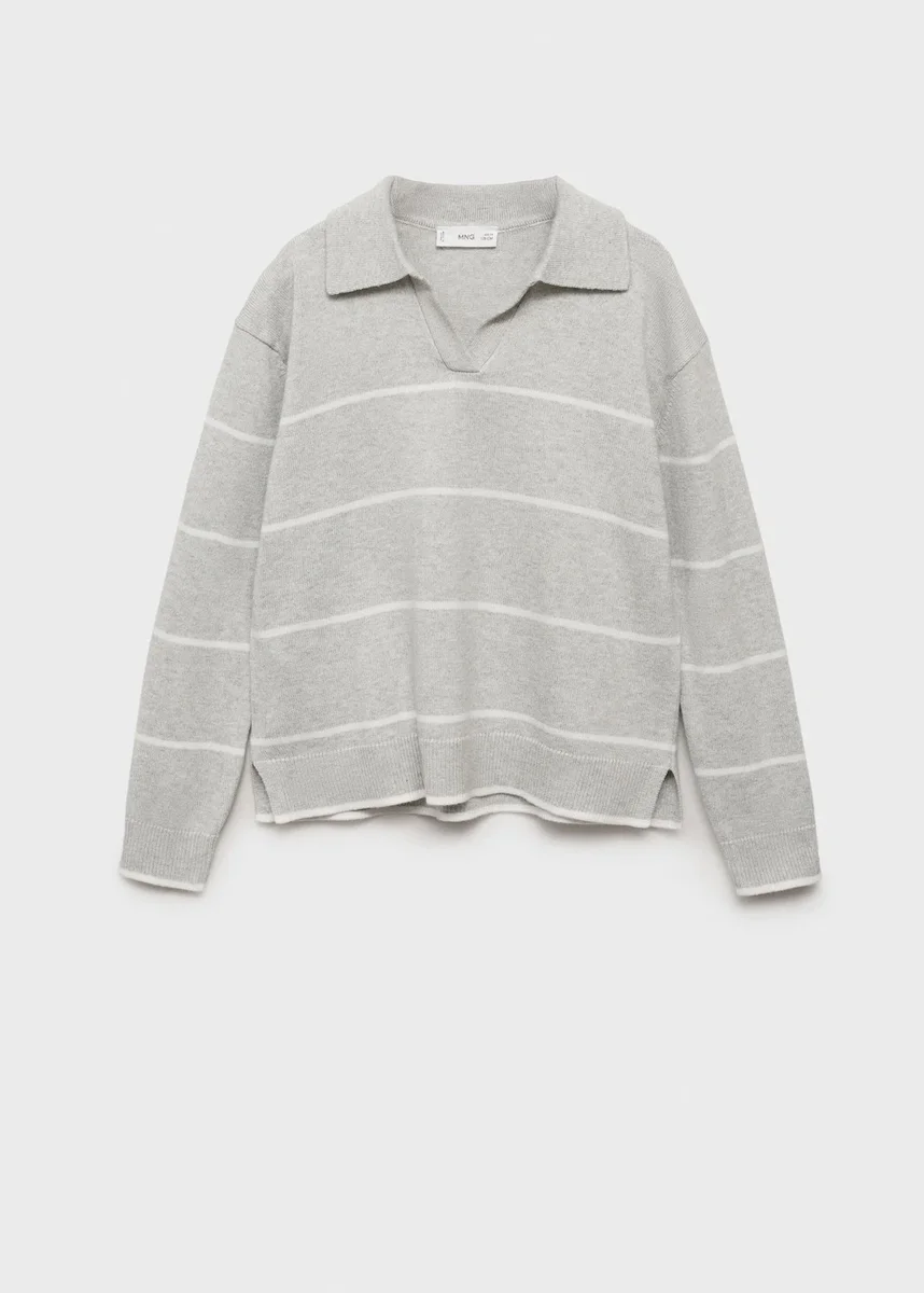 Tessuto in cotone. Tessuto a maglia. Design dritto. Design a righe. Polo con collo senza bottoni. Maniche lunghe. Spacco laterale sull’orlo.
