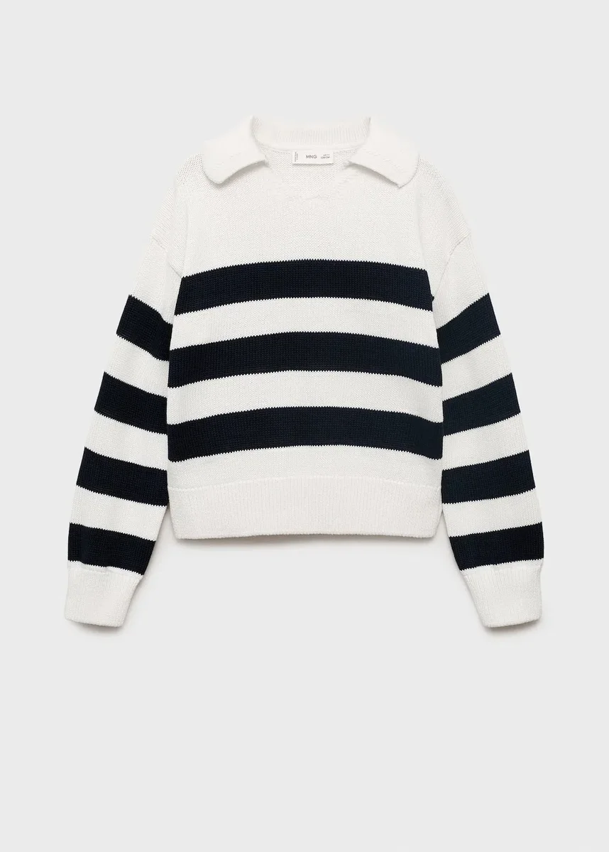 Tessuto a maglia. Tessuto a righe. Modello dritto. Collo polo. Maniche lunghe. Collo, polsini e orlo a costine.