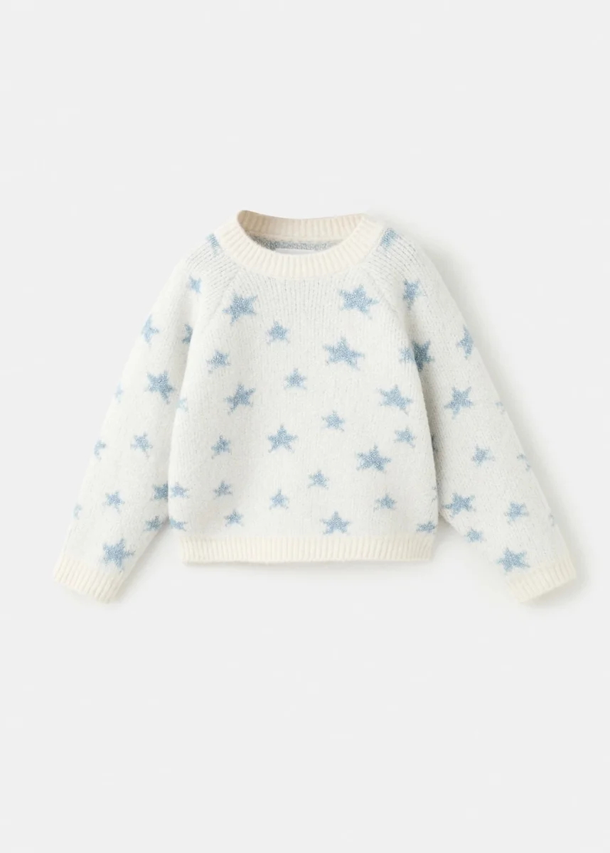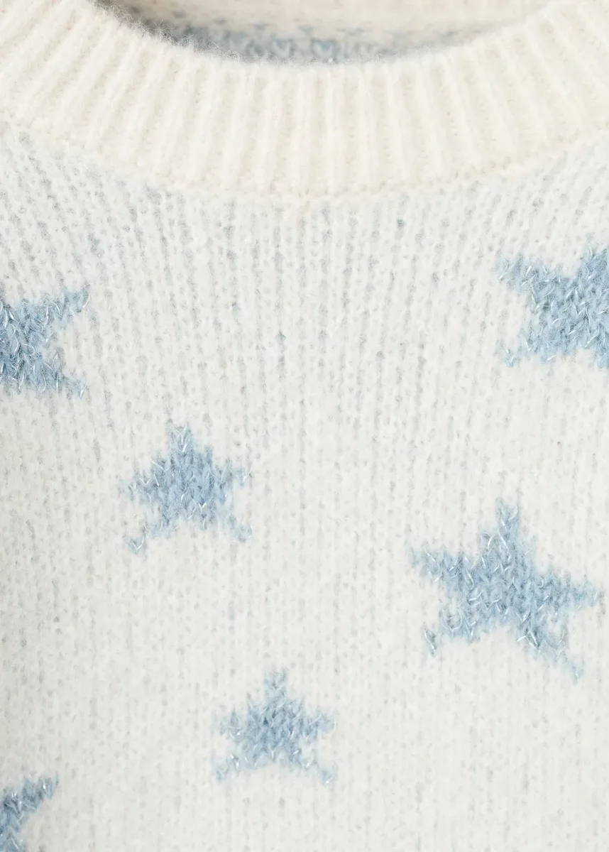 Tessuto a maglia. Tessuto lurex. Design dritto. Design a stelle. Girocollo. Maniche lunghe. Collo, polsini e orlo a costine.