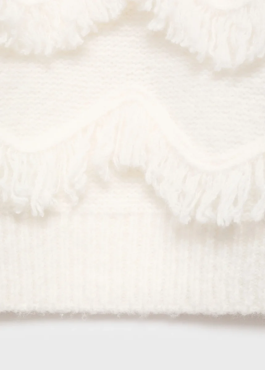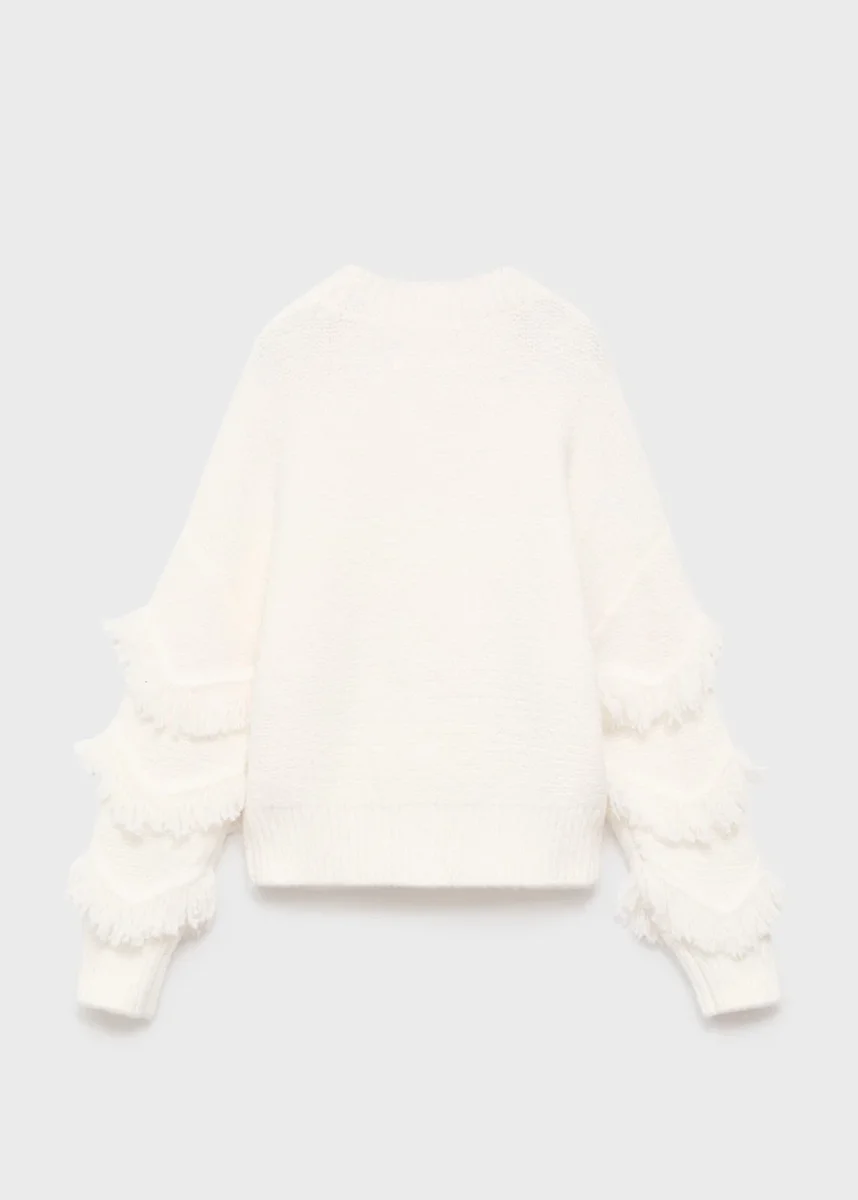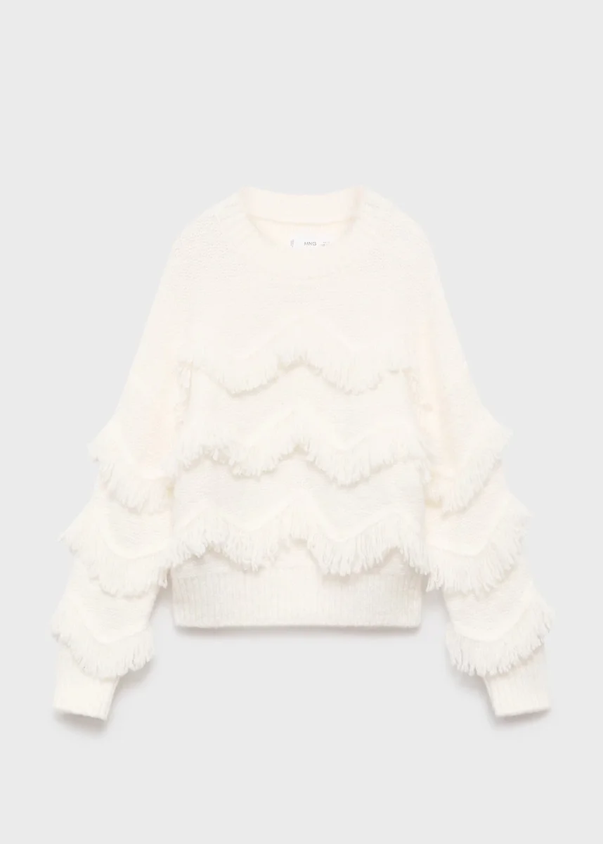 Maglia lavorata a maglia. Design dritto. Design con frange. Applicazioni con frange. Girocollo. Maniche lunghe