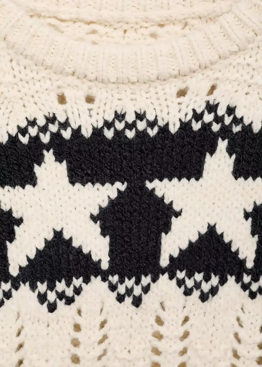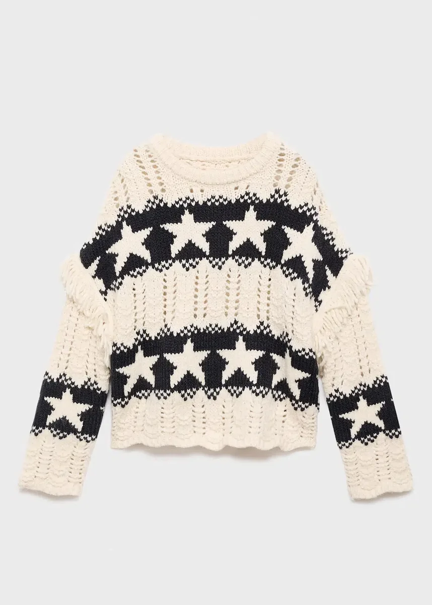 Tessuto all’uncinetto. Design dritto. Design a stelle. Girocollo. Maniche lunghe. Pannello con frange