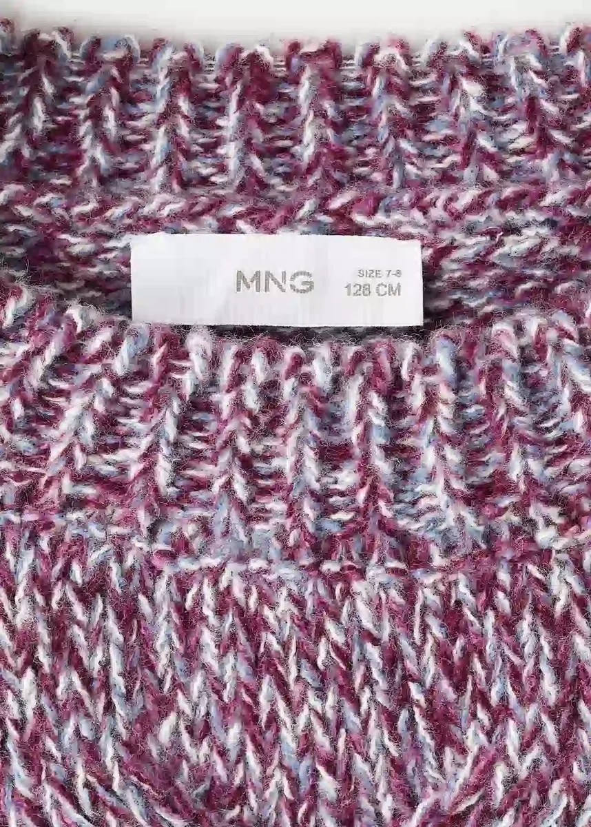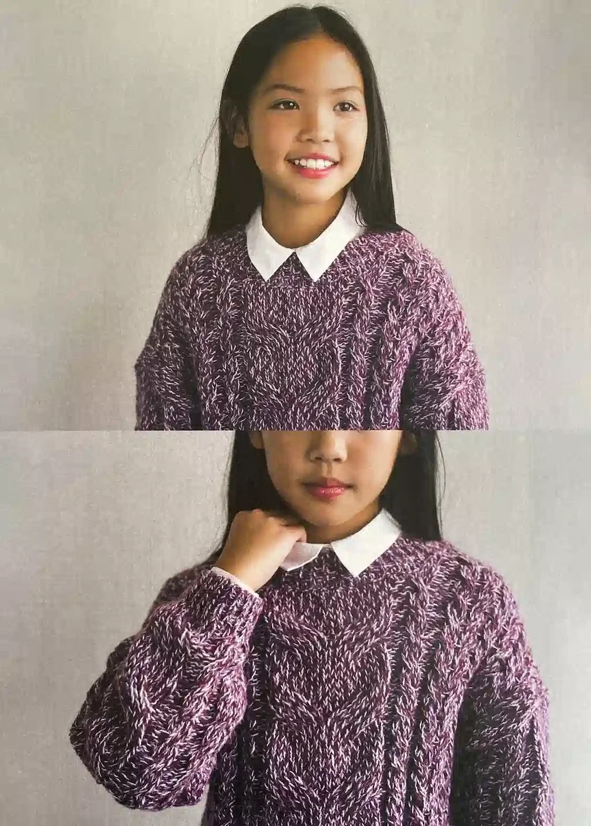 Maglia lavorata a trecce. Design dritto. Girocollo. Maniche lunghe. Colori a contrasto. Collo, polsini e orlo a costine.