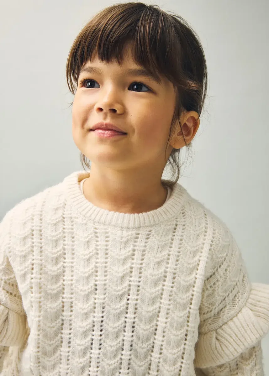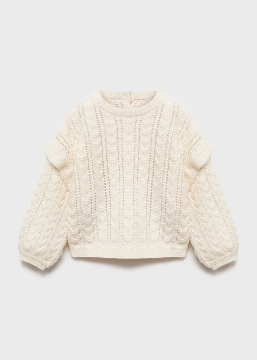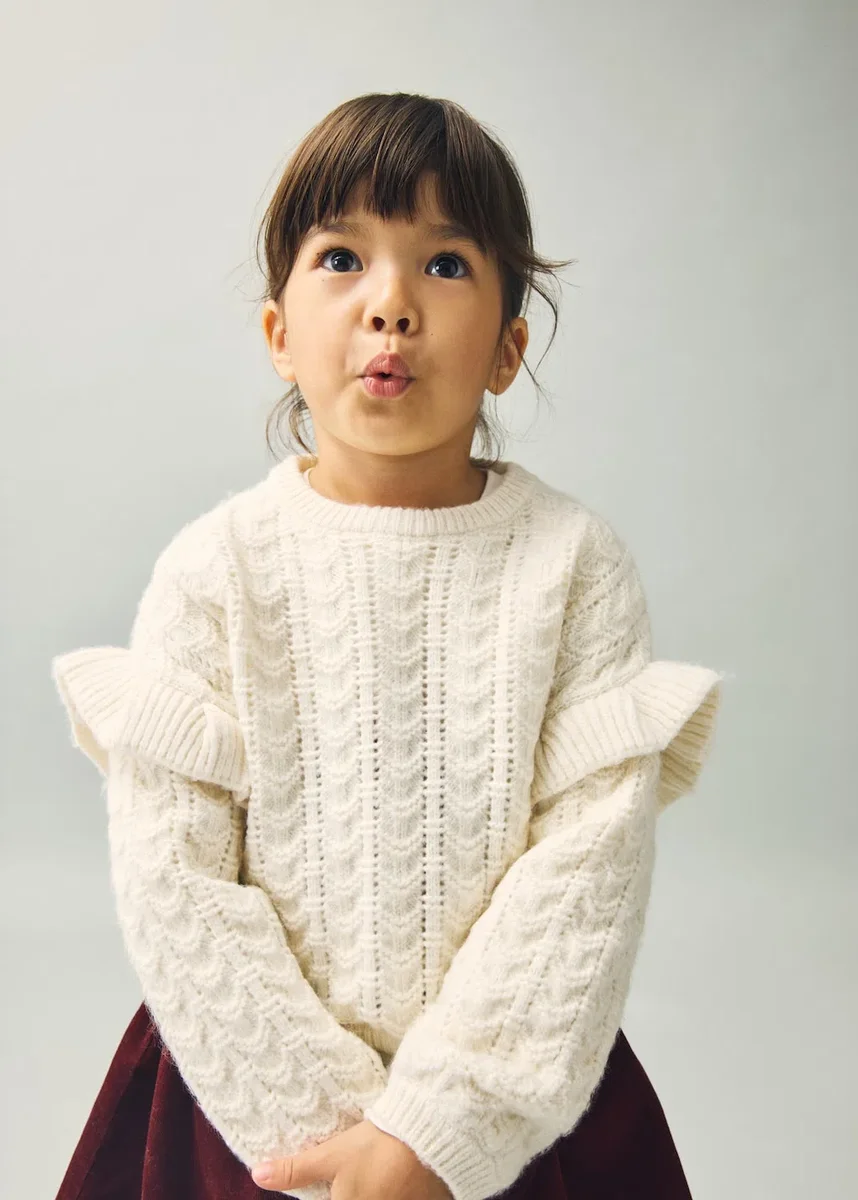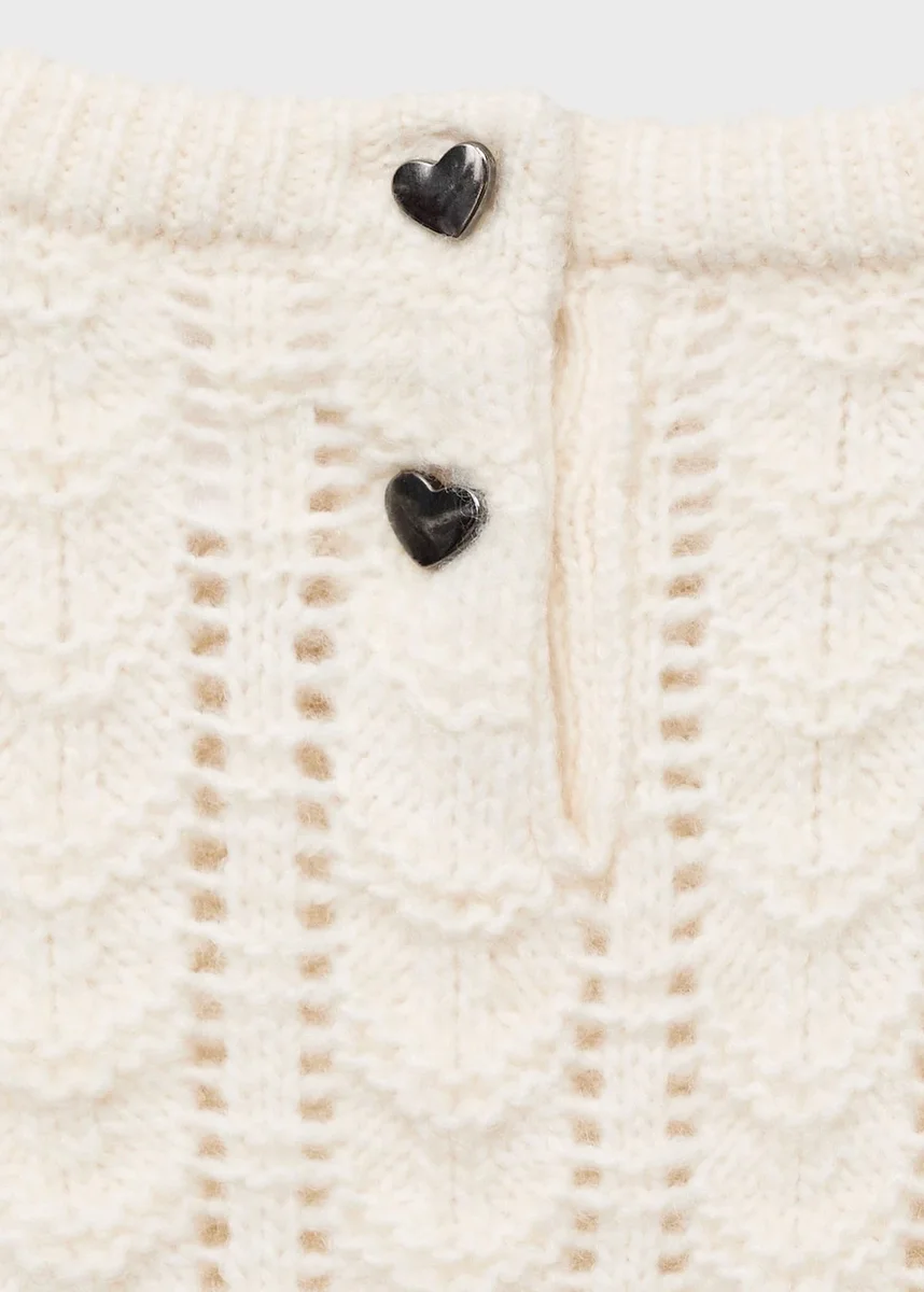 Tessuto lavorato a maglia. Design oversize. Collo rotondo con chiusura a bottoni. Bottoni a forma di cuore. Maniche lunghe. Volant sulle spalle. Dettagli all’uncinetto. Collezione Natale