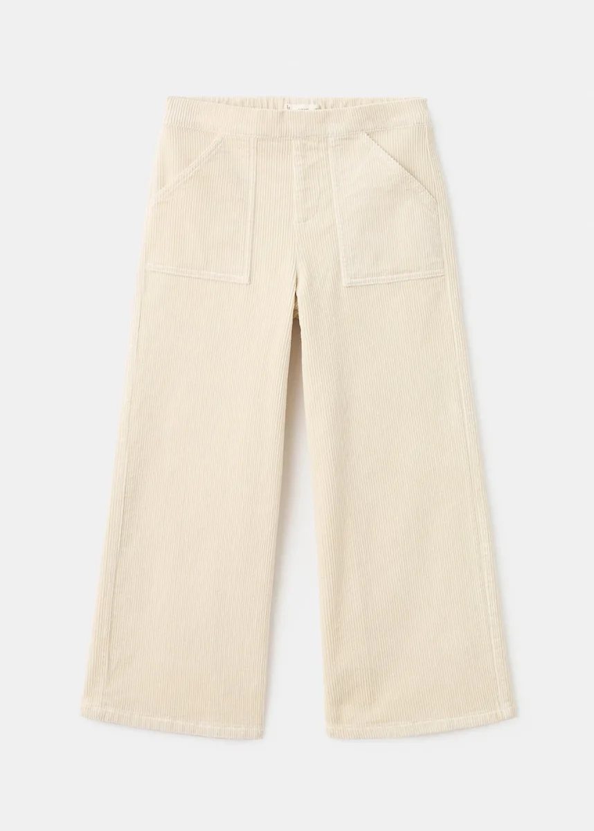Realizzati in tessuto di cotone elasticizzato e velluto a coste, questi pantaloni lunghi a gamba larga offrono comfort e stile. La cintura elasticizzata garantisce una vestibilità perfetta, mentre le due tasche laterali e le due tasche a filetto sul retro aggiungono funzionalità.