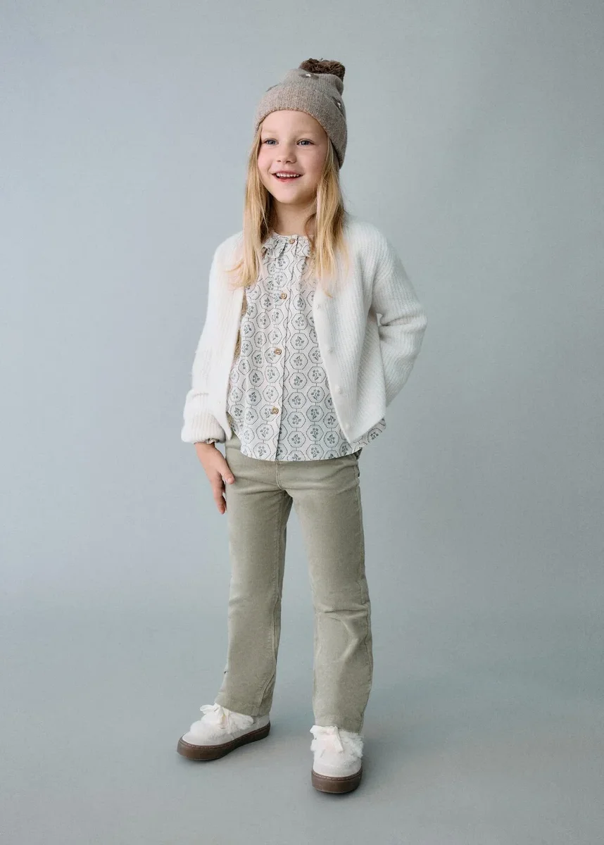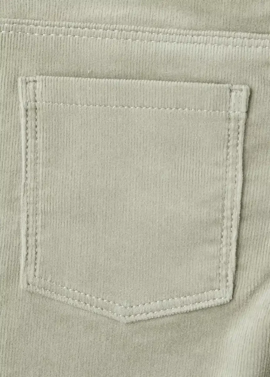 Tessuto misto cotone. Tessuto in velluto a coste. Design a campana. Design lungo. Passanti per cintura. Cinque tasche. Chiusura con bottone a pressione.