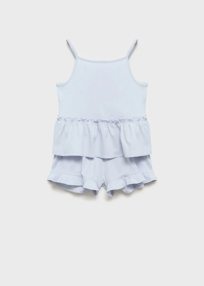 Set composto da t-shirt e pantaloni pigiama. 100% cotone. Girocollo. Senza maniche. Dettaglio con volant. Prodotto in promozione.
