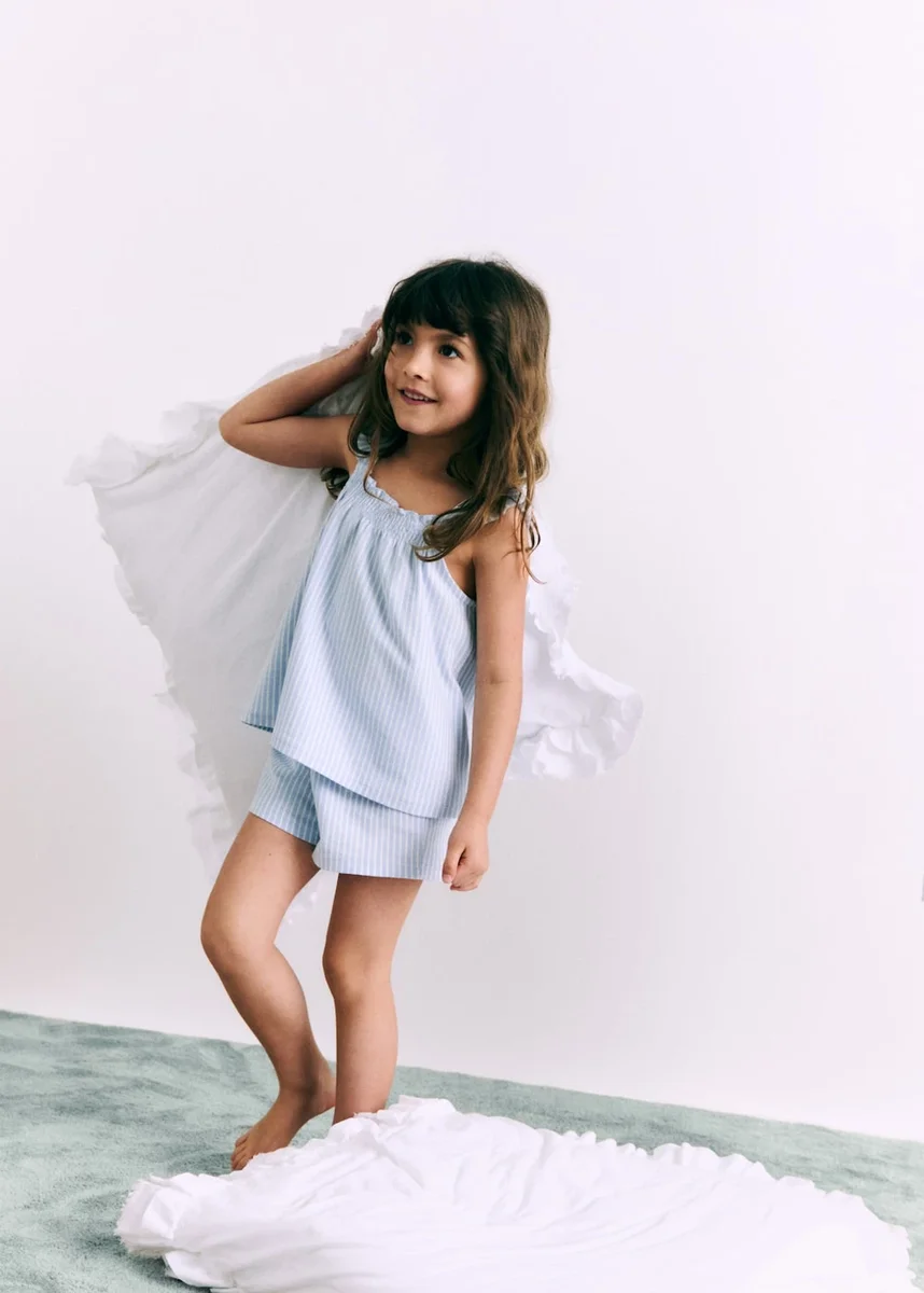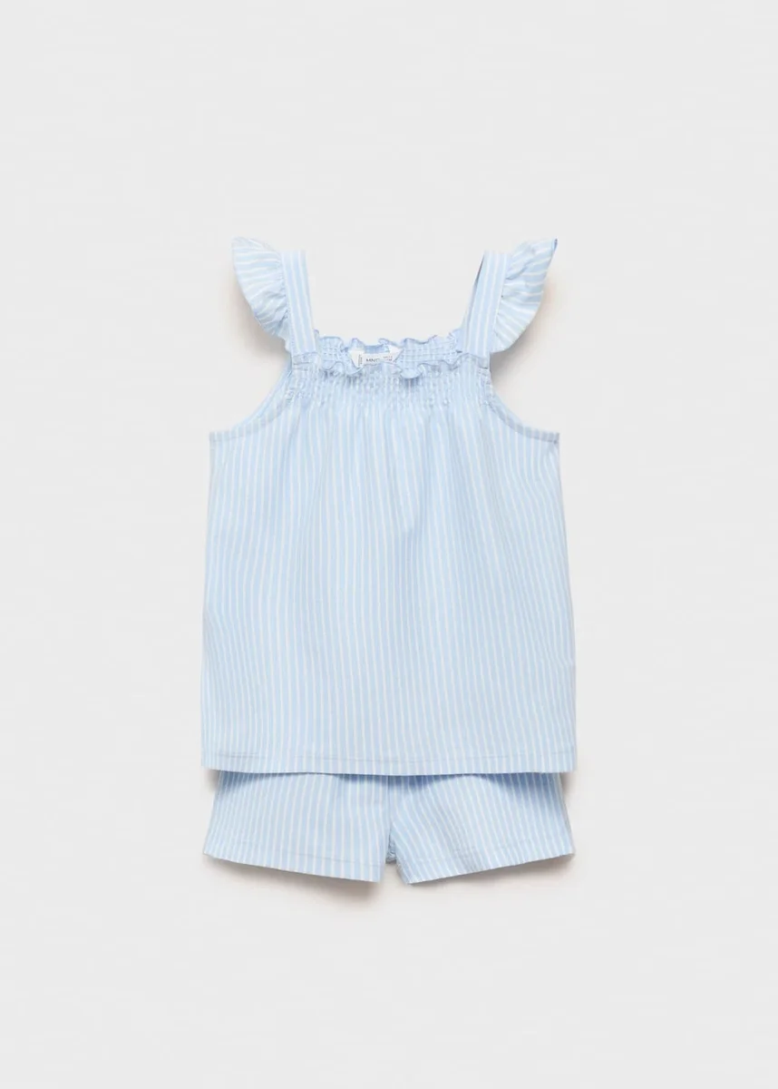 100% cotone. Modello dritto. Modello corto. Design a righe. Dettaglio volant sulle spalle. Scollo quadrato. Senza maniche. Elastico in vita. Dettaglio arricciato.