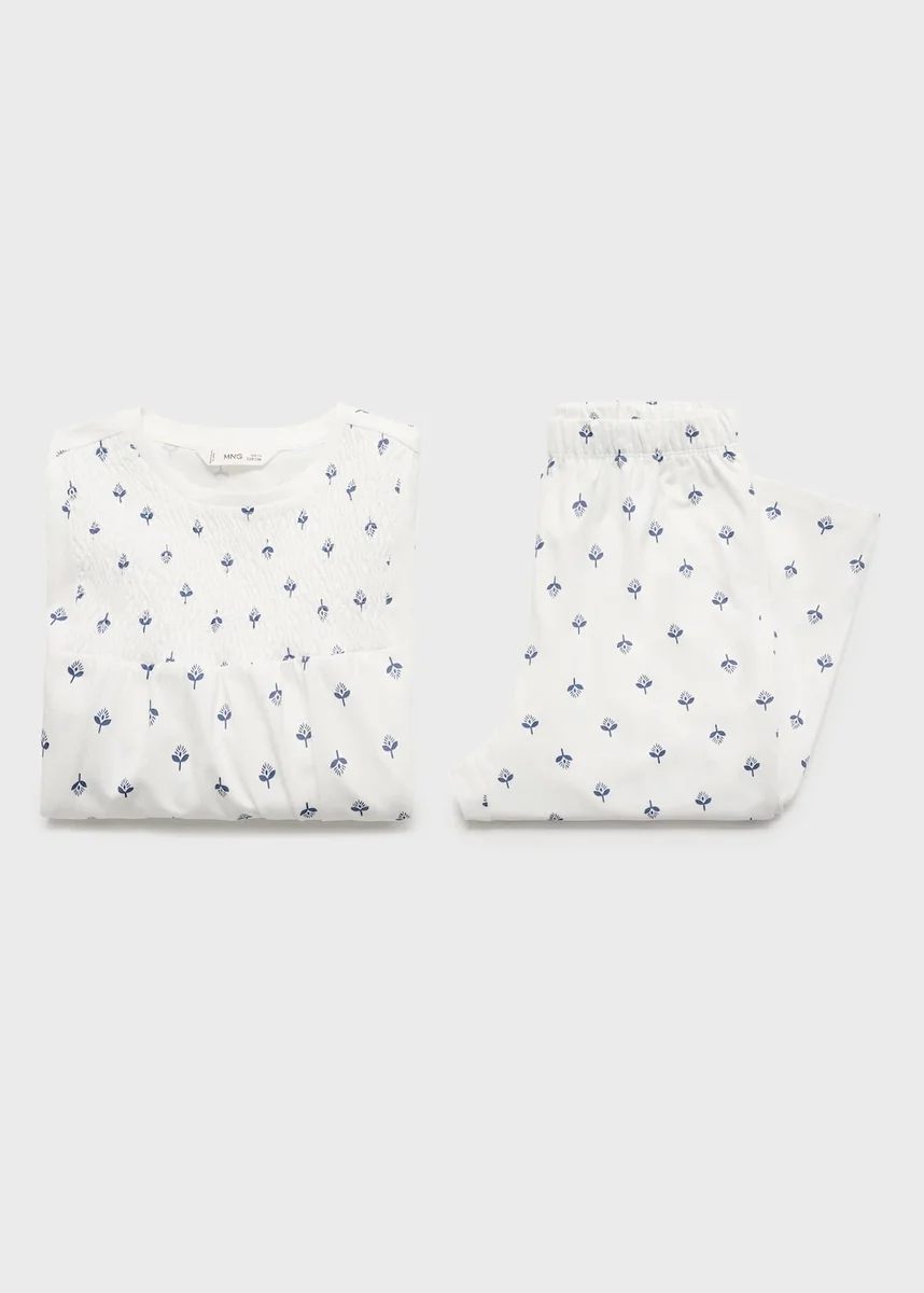 Tessuto in cotone. Modello lungo. Motivo stampato. Girocollo. Maniche lunghe con polsini elasticizzati. Motivo a nido d’ape. Elastico in vita. Set pigiama due pezzi.