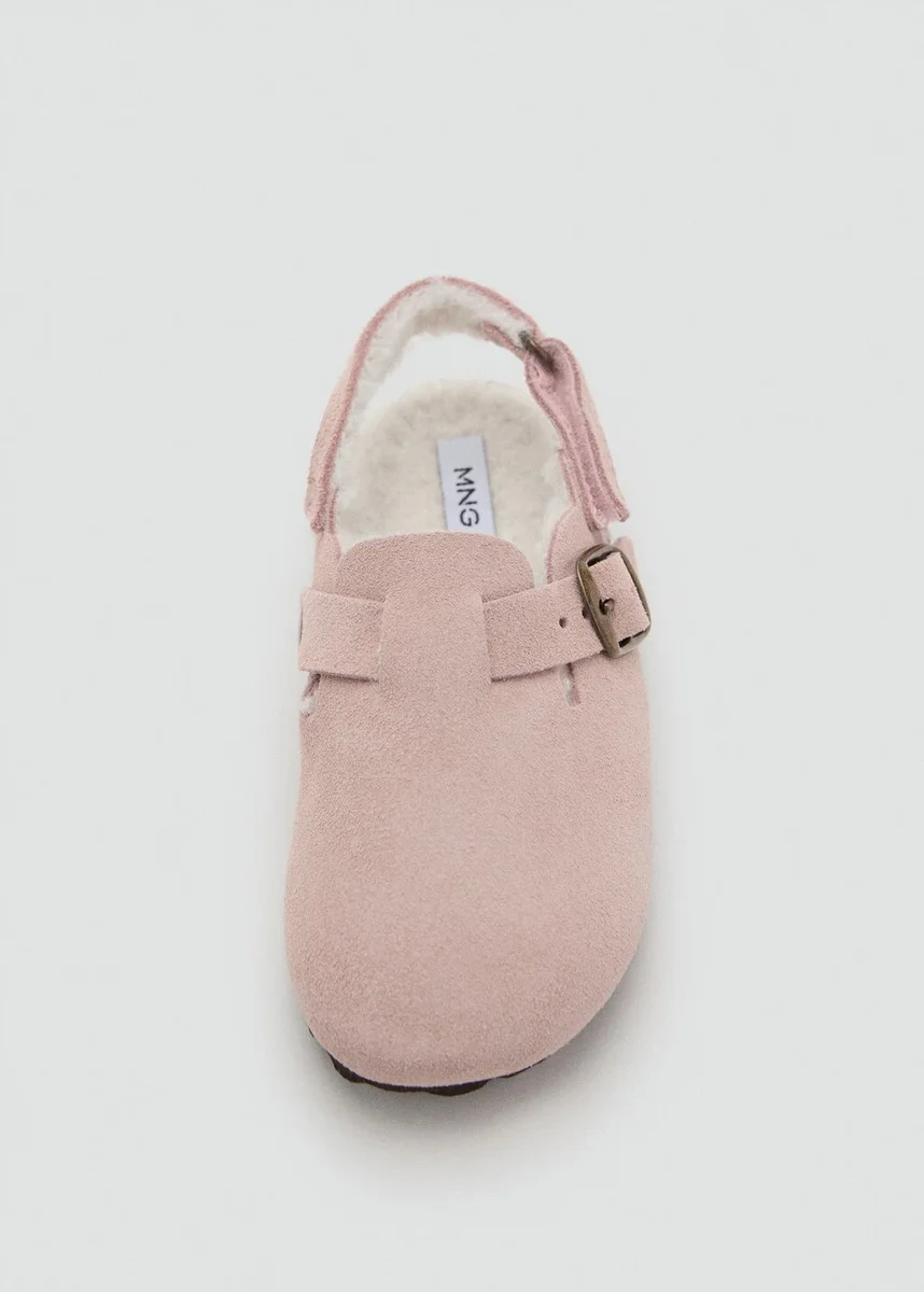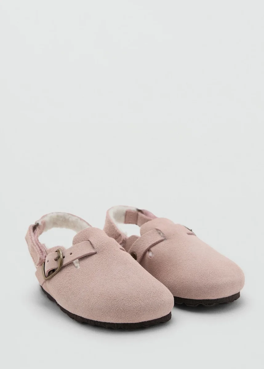 Pelle bovina. Modello zoccolo. Punta arrotondata. Interno in finta pelle di montone. Spacco posteriore. Fibbia decorativa. Chiusura in velcro