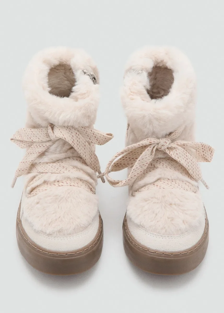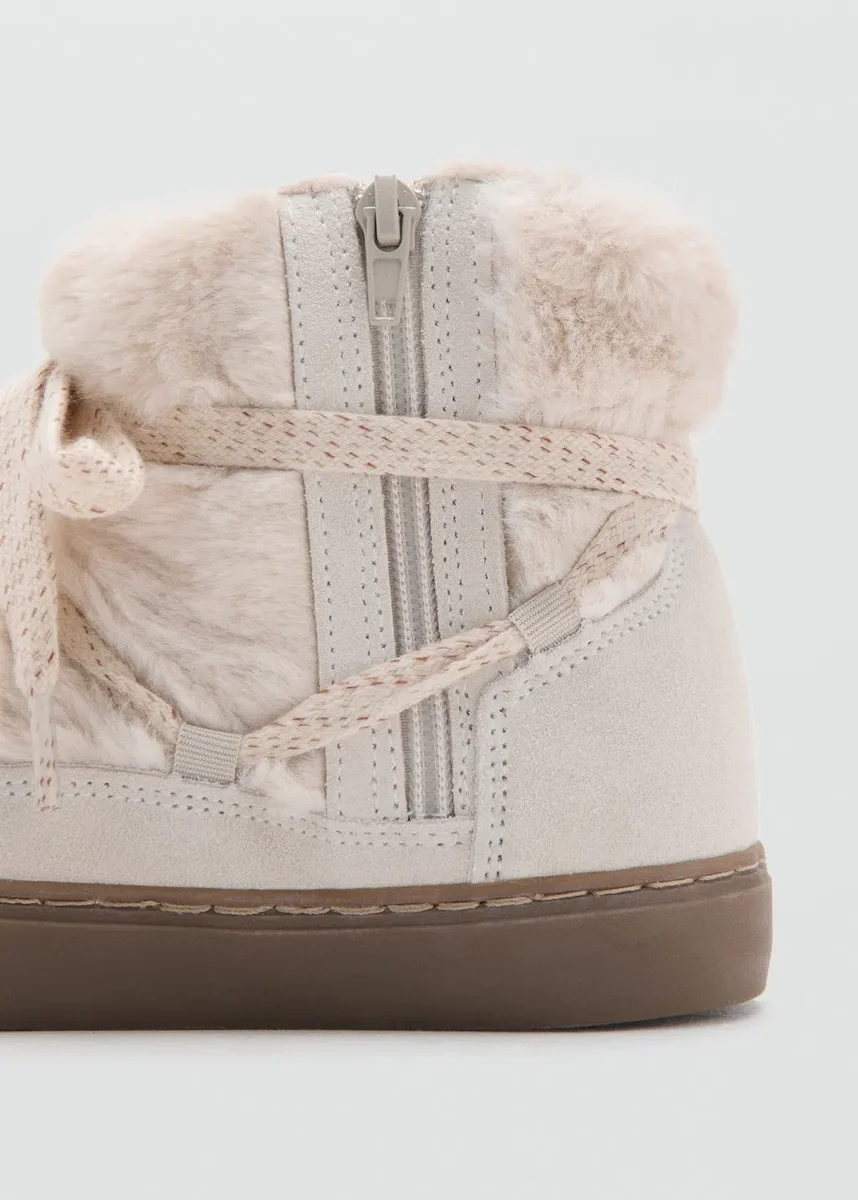 Pelle bovina. Tessuto pelliccia. Disegno neve. Punta tonda. Suola in gomma. Chiusura con passante. Chiusura con zip laterale. Collezione Natale.