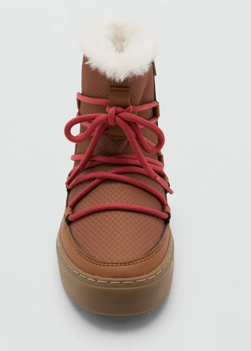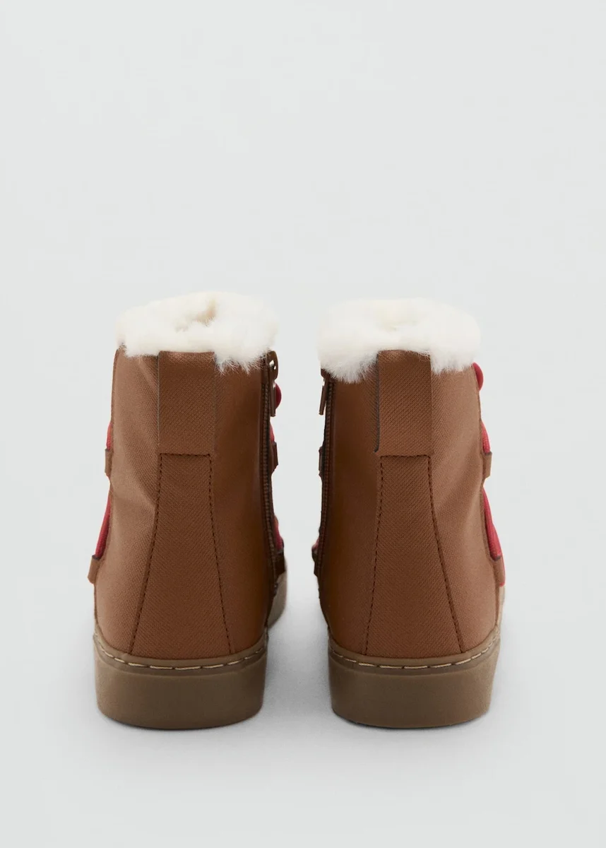 Pelle bovina. Fodera effetto pelliccia. Motivo neve. Punta arrotondata. Lacci intrecciati. Chiusura con zip laterale. Suola in gomma. Collezione Natale.