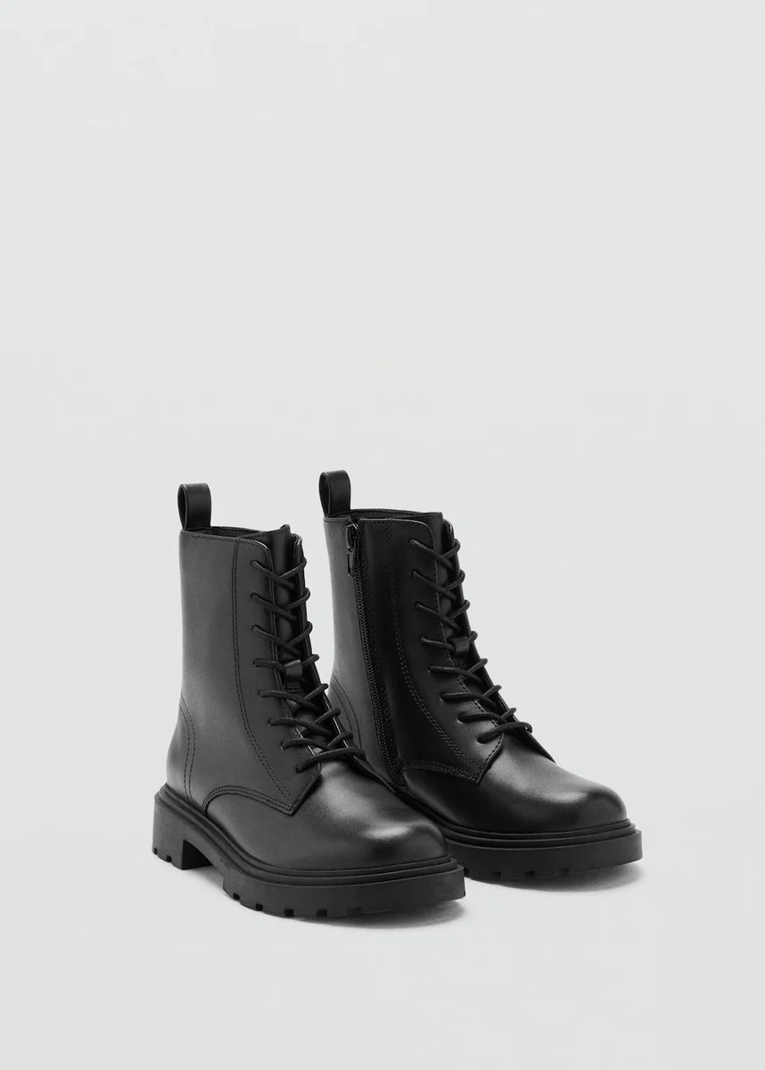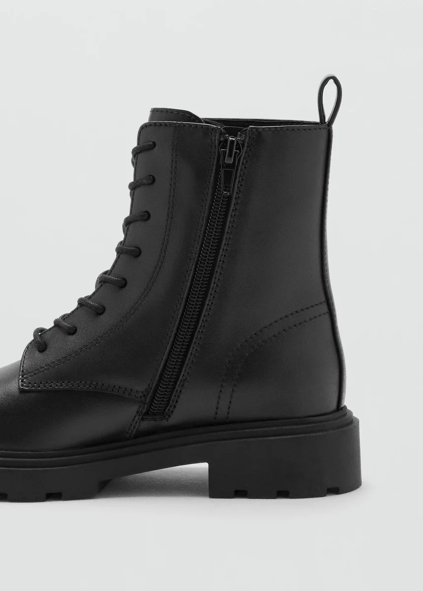 Pelle bovina. Punta arrotondata. Chiusura con lacci. Chiusura con cerniera. Suola dentellata.