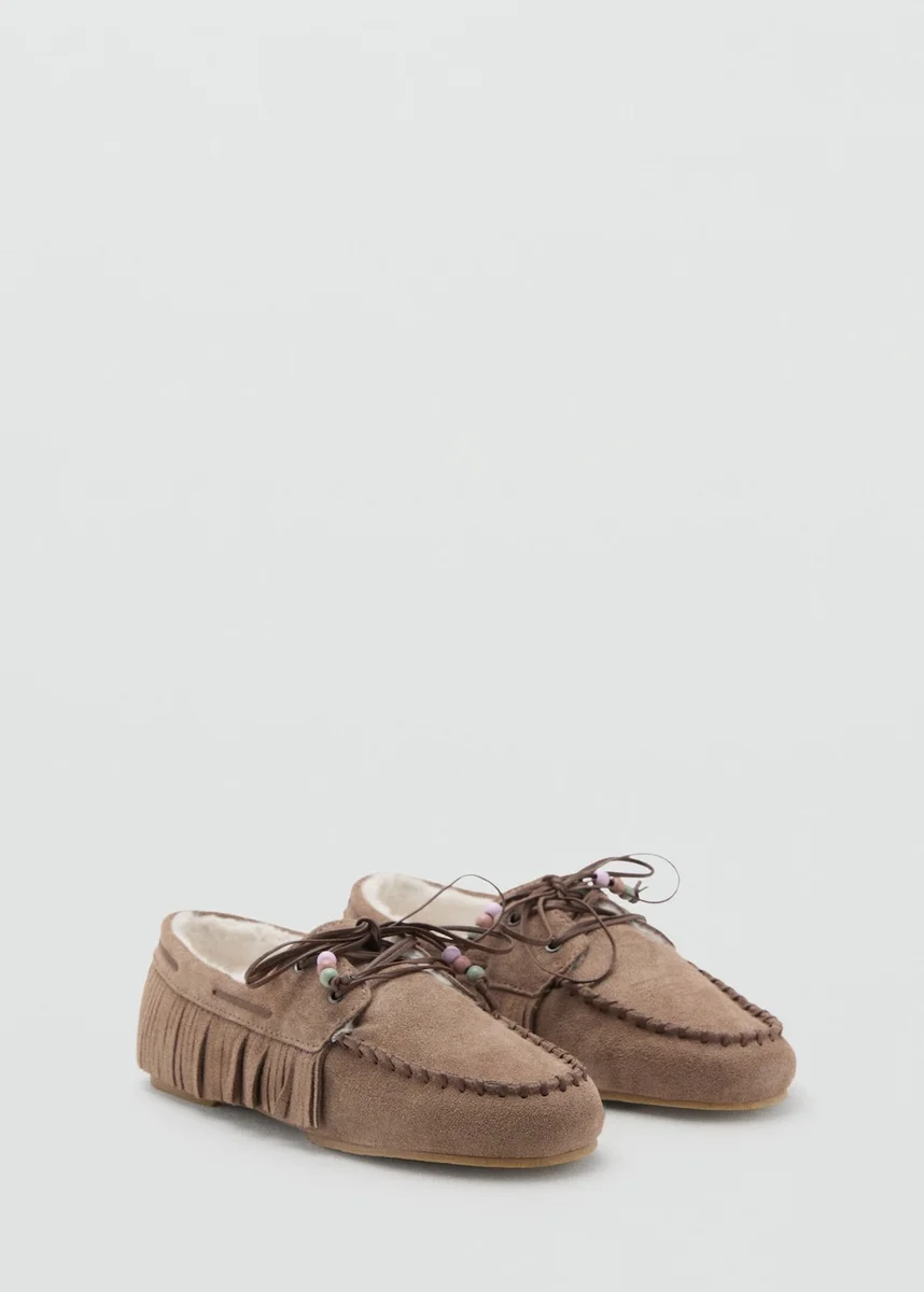 Esclusiva online. Pelle bovina. Camoscio. Interno in finta pelle di montone. Punta arrotondata. Chiusura con lacci. Dettagli con perline. Collezione Natale.