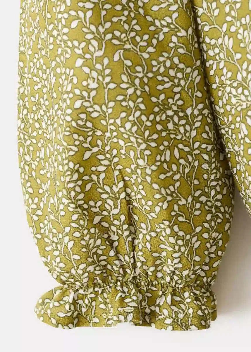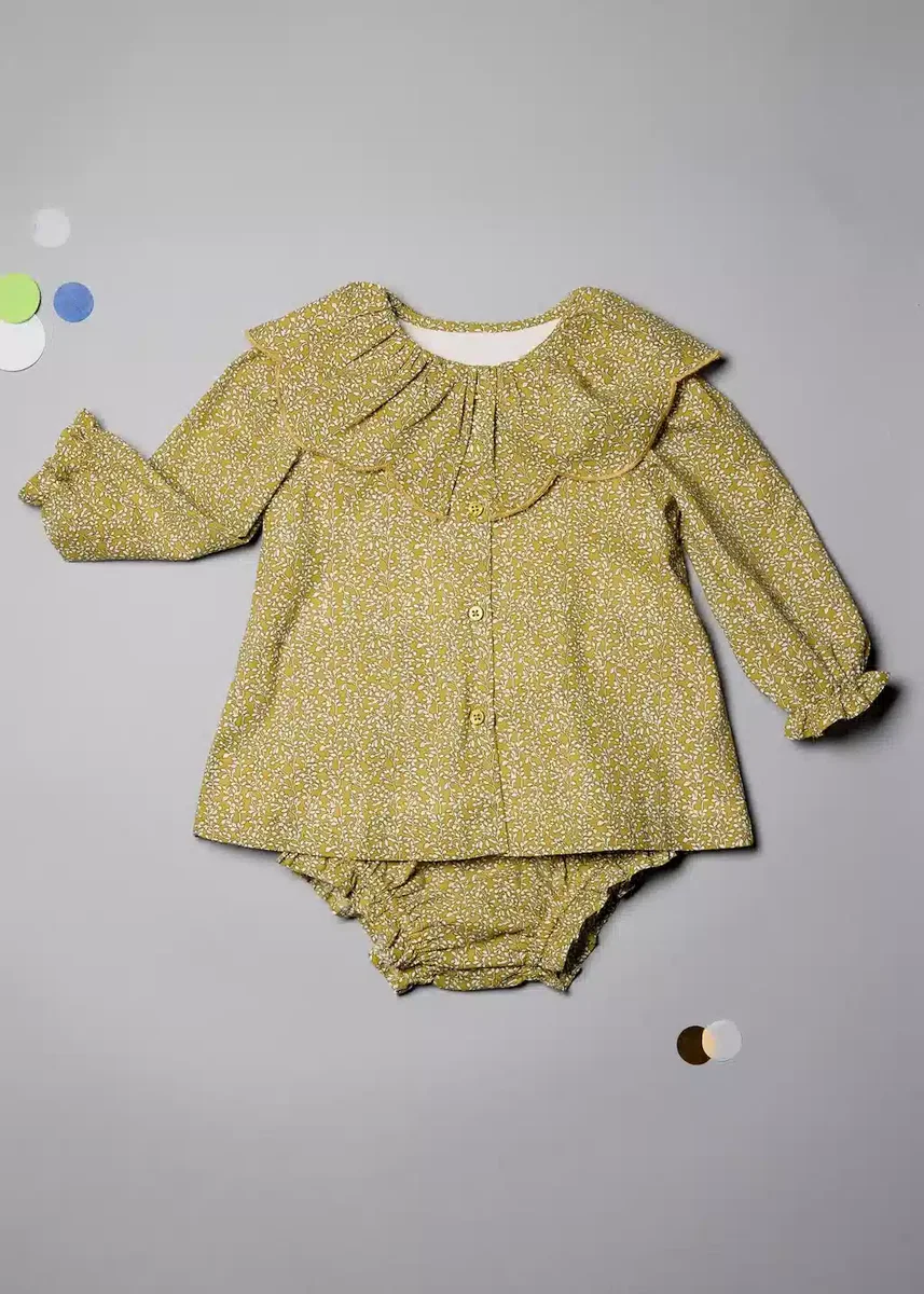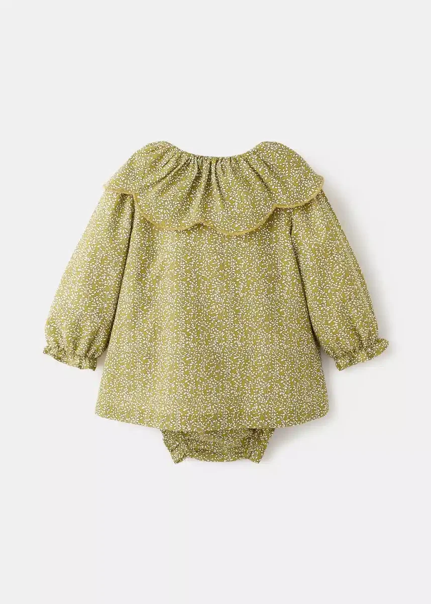 100% cotone. Stampa floreale. Colletto babydoll. Maniche lunghe con bordi a costine. Chiusura frontale con bottoni. Copripannolino in cotone stampato. Collezione Natale.