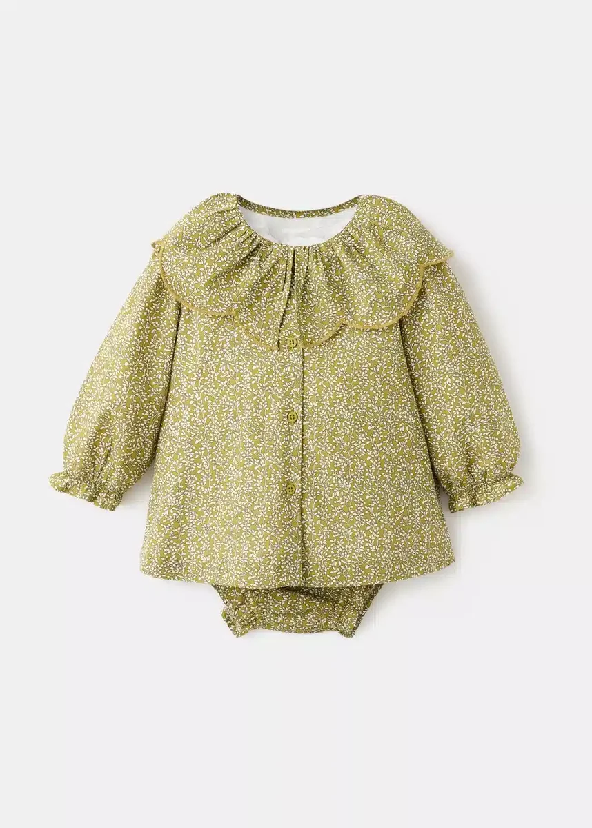 Tessuto 100% cotone. Motivo floreale stampato. Colletto babydoll. Maniche lunghe con bordi a costine. Chiusura frontale con bottoni. Copripannolino in cotone stampato. Collezione Natale