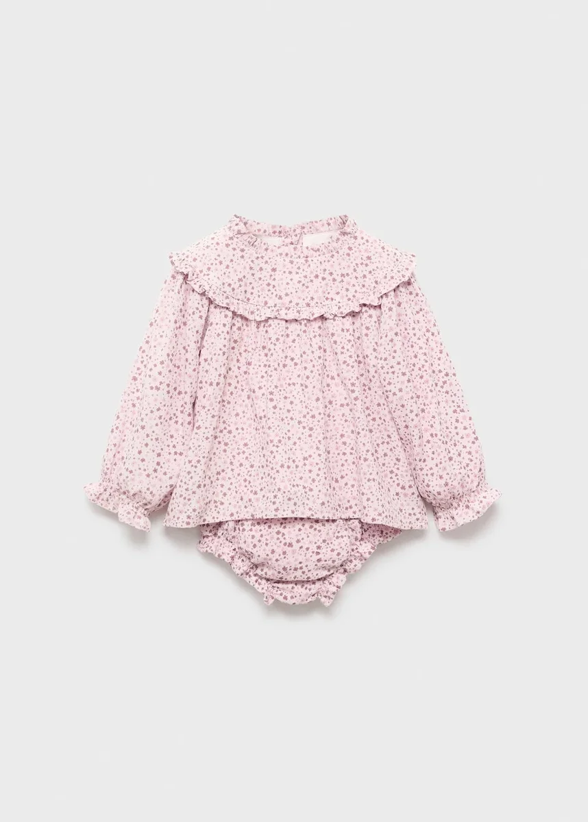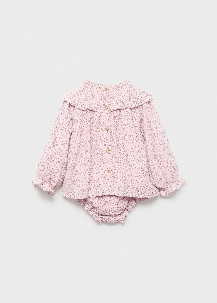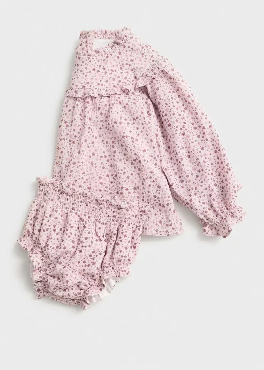 Tessuto in viscosa. Stampa floreale. Modello svasato. Scollo arricciato. Chiusura con bottoni sul retro. Maniche lunghe con polsini elasticizzati. Vita elasticizzata con smock. Orlo elasticizzato