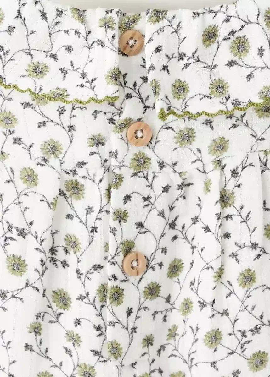 Tessuto 100% cotone. Stampa floreale. Colletto Peter Pan. Dettaglio ricamato sul collo. Maniche lunghe. Chiusura con bottoni sul retro. Apertura sul fondo con chiusura con bottoni. Collezione Natale