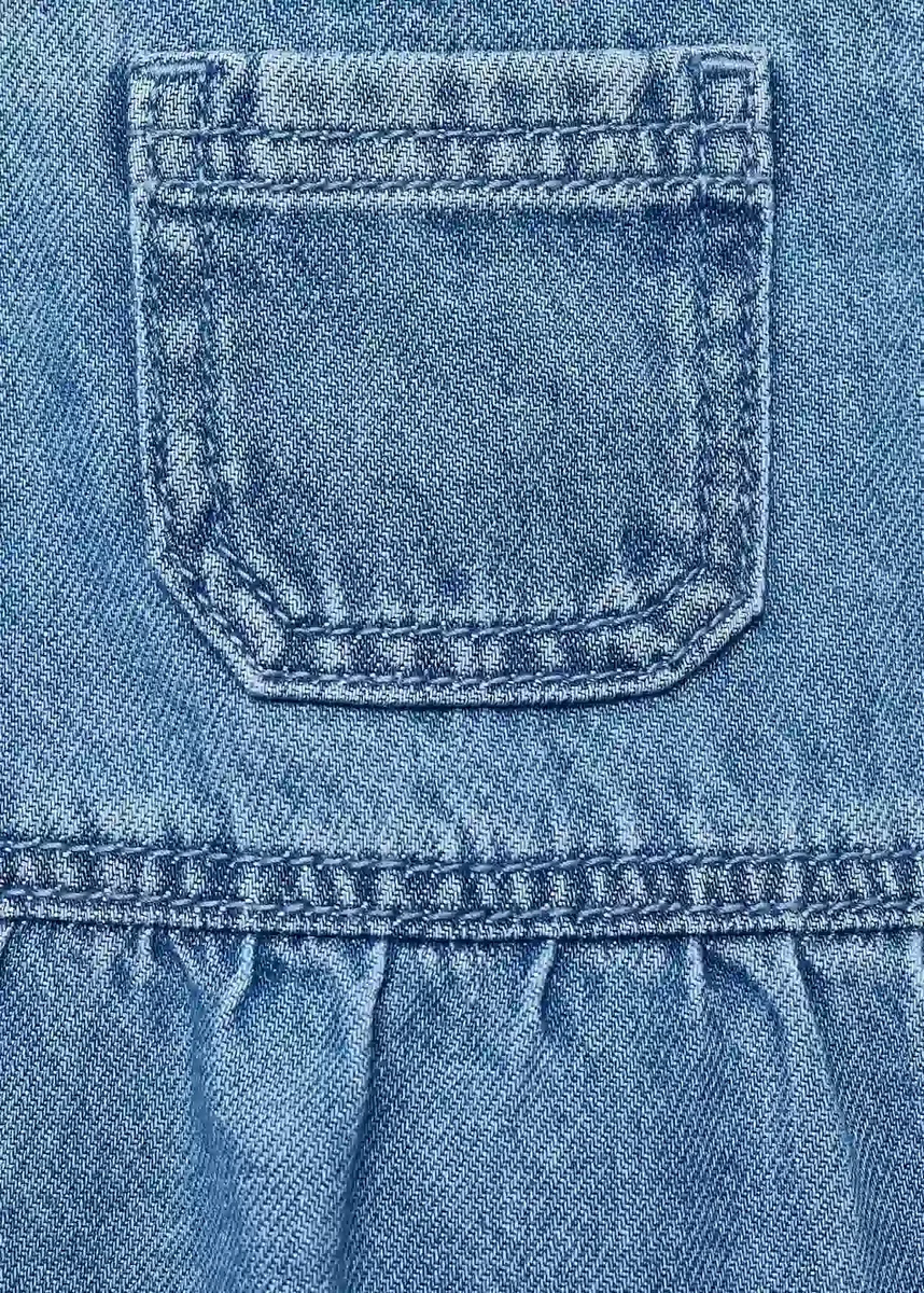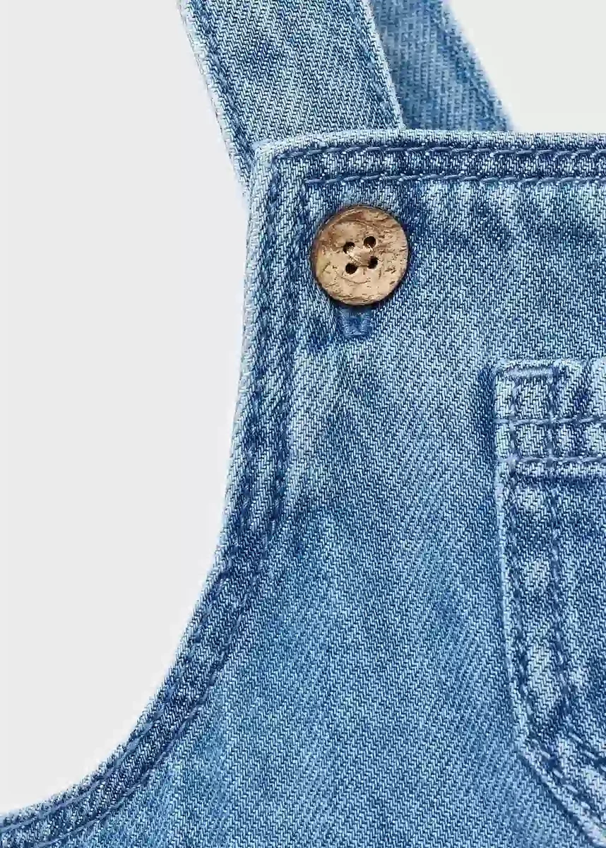 Chiusura frontale. Struttura piatta media. Tessuto 100% cotone. Stile jeans denim. Modello corto. Scollo dritto. Spalline con chiusura a bottone. Tasca applicata sul davanti. Elastico in vita. Spalline incrociate sul retro.