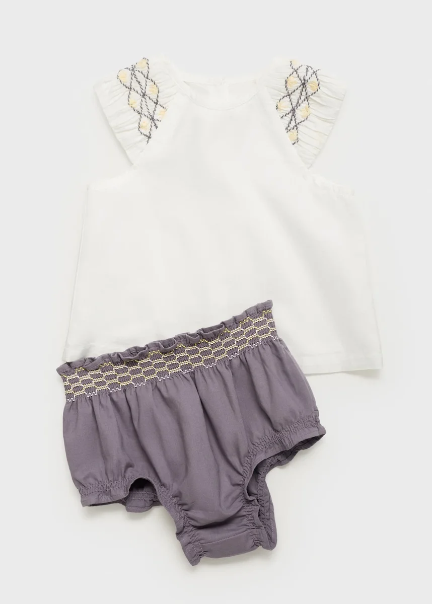 100% cotone. Design svasato. Bretelle con design arricciato e dettagli ricamati. Girocollo. Chiusura con bottoni sul retro. Set.