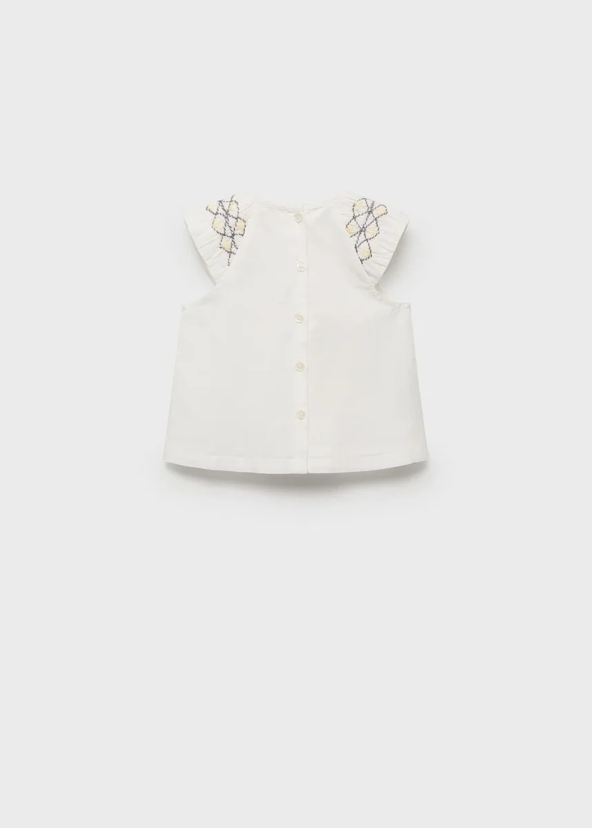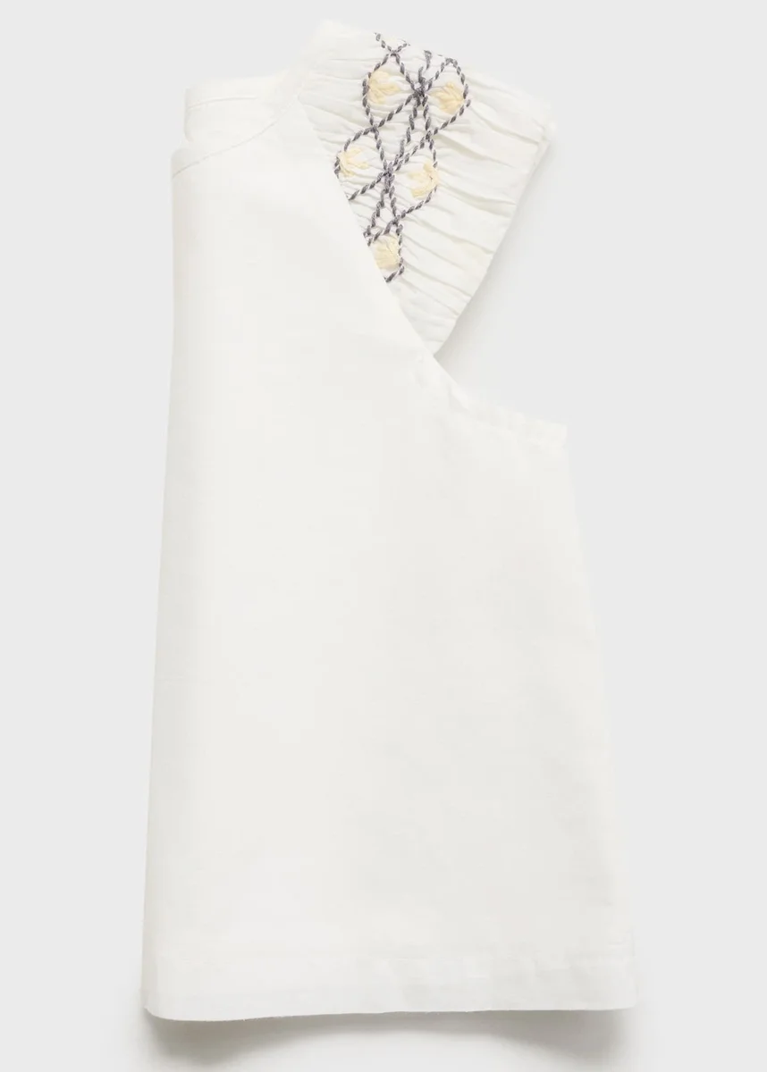 Tessuto 100% cotone. Design svasato. Bretelle con design arricciato e dettagli ricamati. Girocollo. Chiusura con bottoni sul retro. Set
