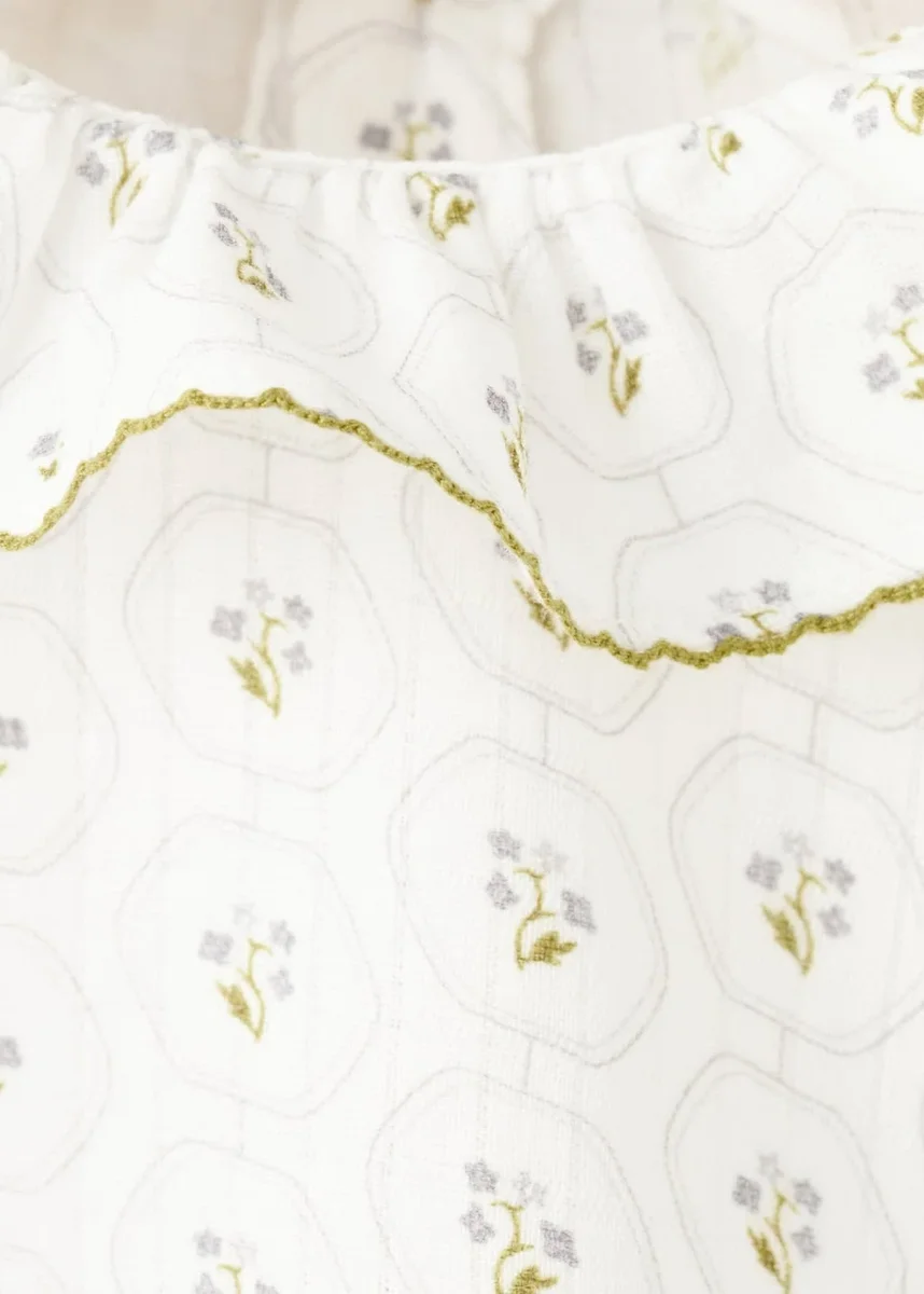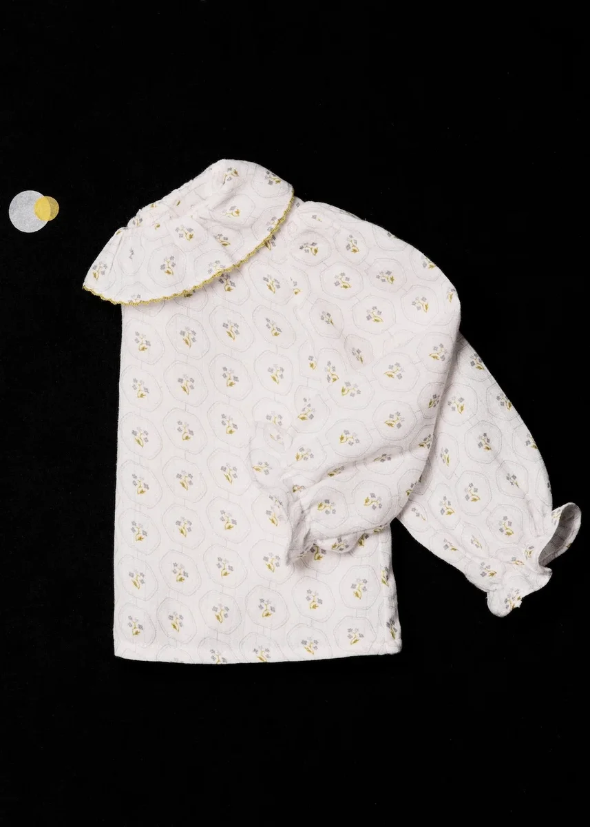 Tessuto 100% cotone. Disegno stampato. Stampa floreale. Colletto Peter Pan. Girocollo. Maniche lunghe con bordi a costine. Chiusura con bottoni. Collezione Natale.