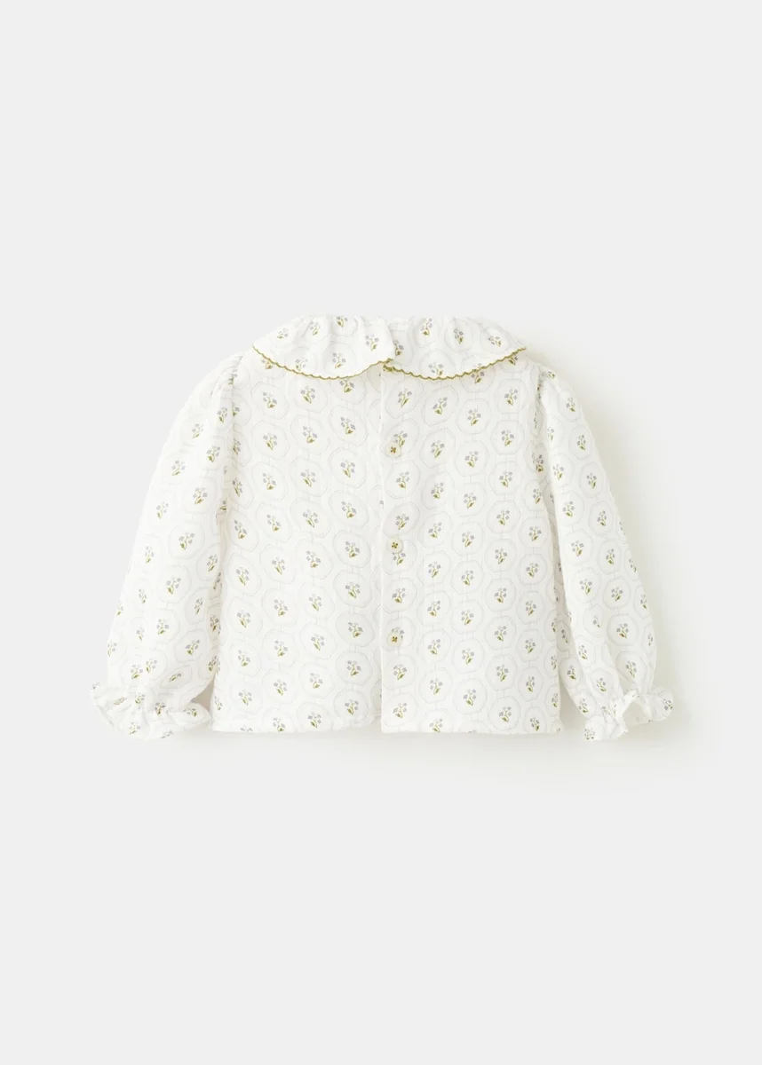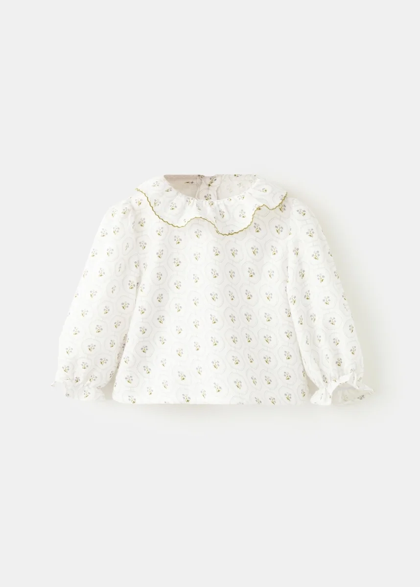 Tessuto 100% cotone. Motivo stampato. Stampa floreale. Colletto Peter Pan. Girocollo. Maniche lunghe con bordi a costine. Chiusura con bottoni. Collezione Natale