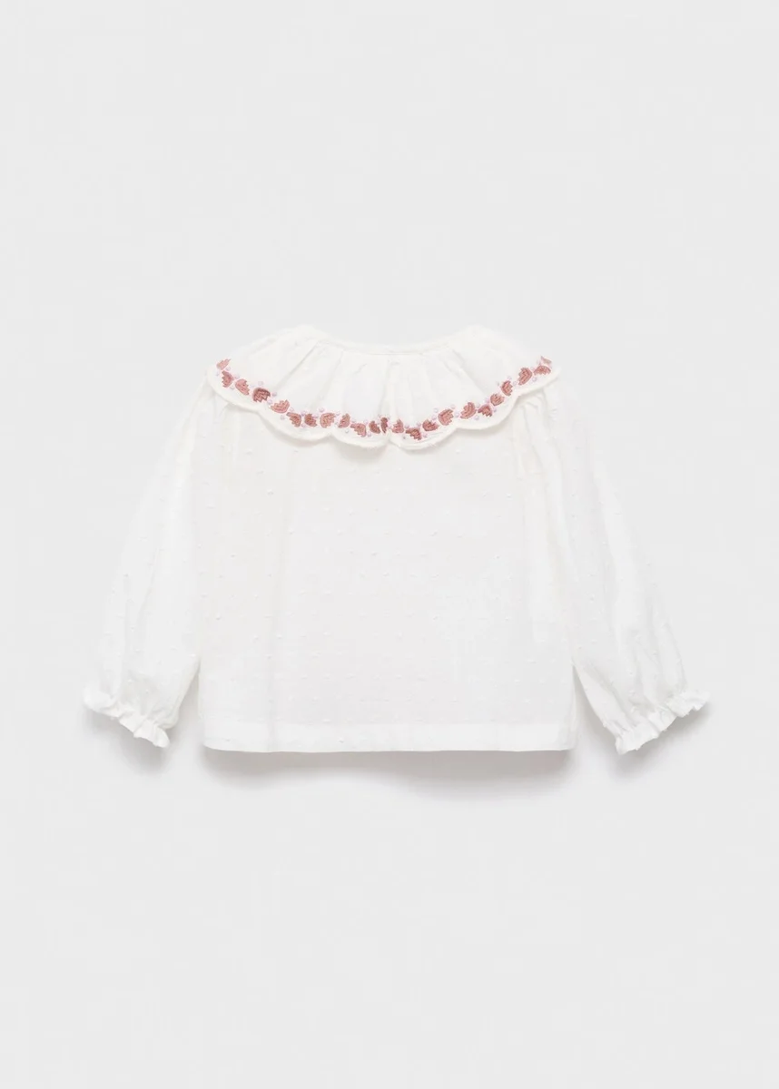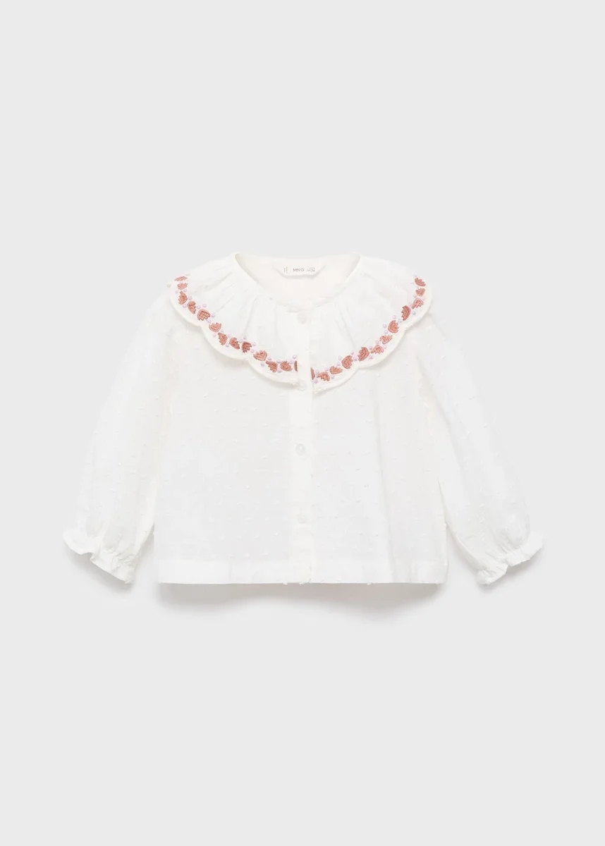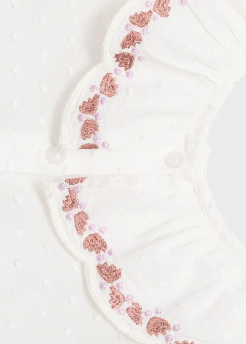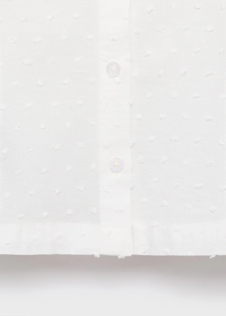 Tessuto 100% cotone. Tessuto plumetis. Modello svasato. Collo babydoll. Maniche lunghe con bordi a costine. Dettagli ricamati. Chiusura con bottoni sul davanti. Collezione Natale.