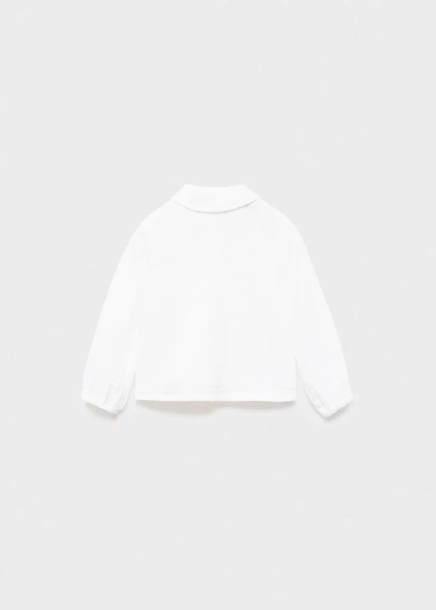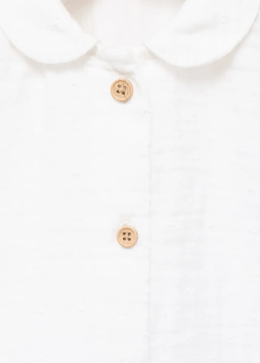 Tessuto 100% cotone. Tessuto bambula. Design dritto. Colletto Peter Pan. Maniche lunghe con polsini elasticizzati. Chiusura con bottoni sul davanti.