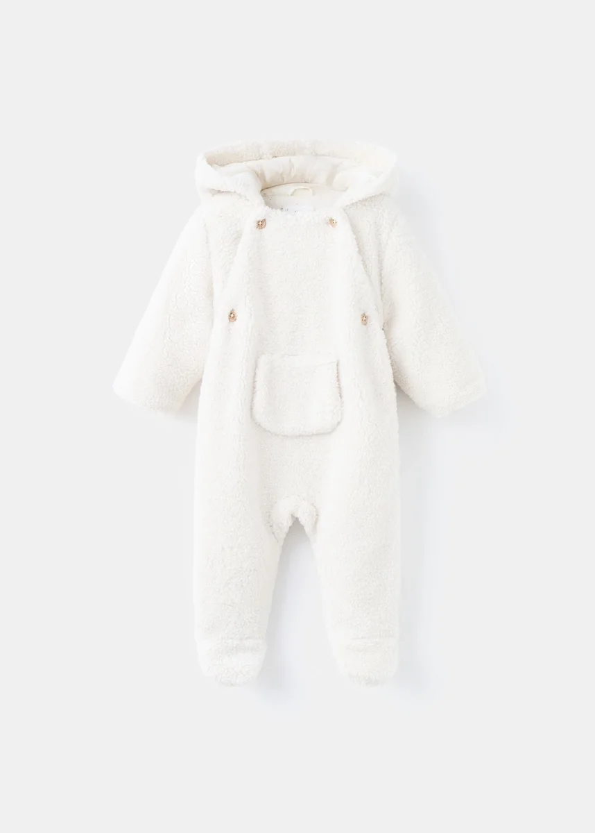 Tessuto sherpa. Modello lungo. Con cappuccio. Piccoli dettagli a forma di orecchie sul cappuccio. Maniche lunghe. Tasca applicata sul davanti. Chiusura frontale con zip e bottoni. Collezione Natale
