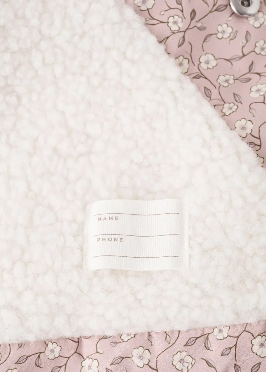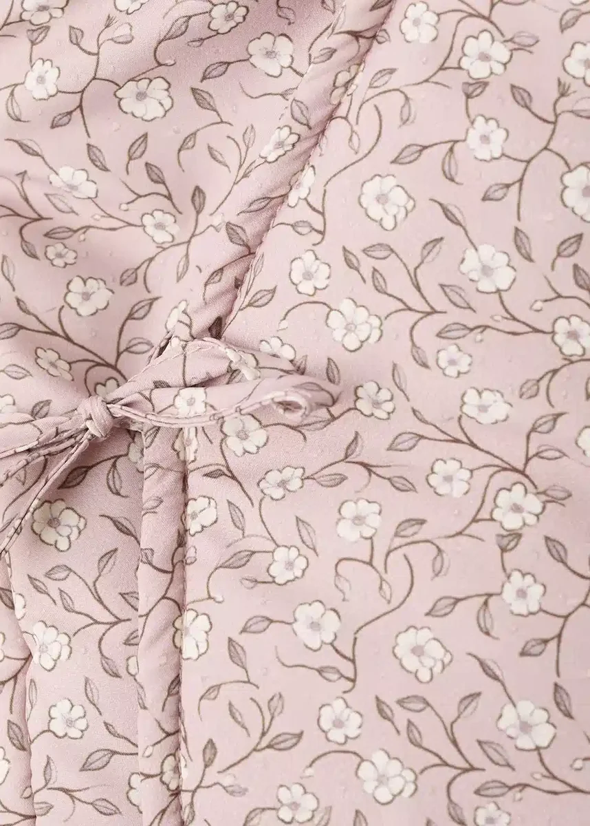 Tessuto trapuntato. Interno in finta pelle di montone. Motivo floreale. Chiusura con fiocco incrociato. Con cappuccio. Maniche lunghe.